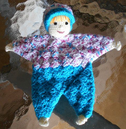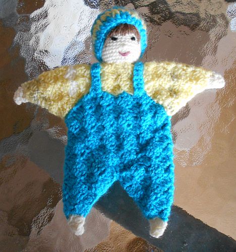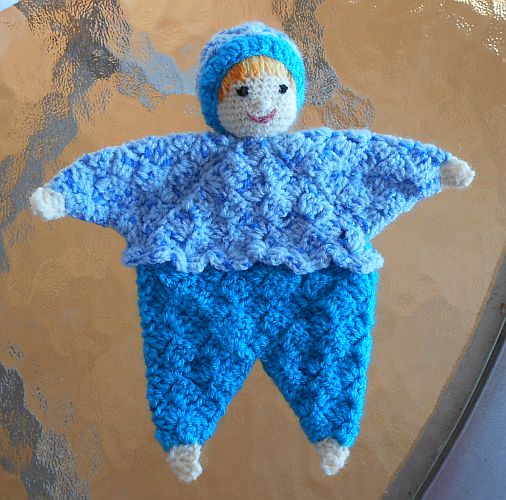 | Dieser Muckele-Junge hat eine Pudelmütze auf - eine Häkelprobe findet eine gute Verwendung | ||