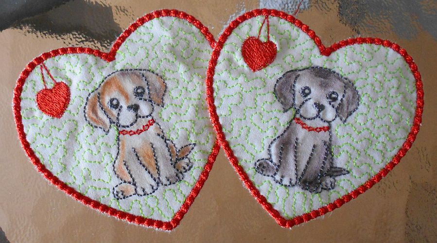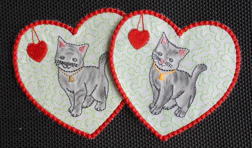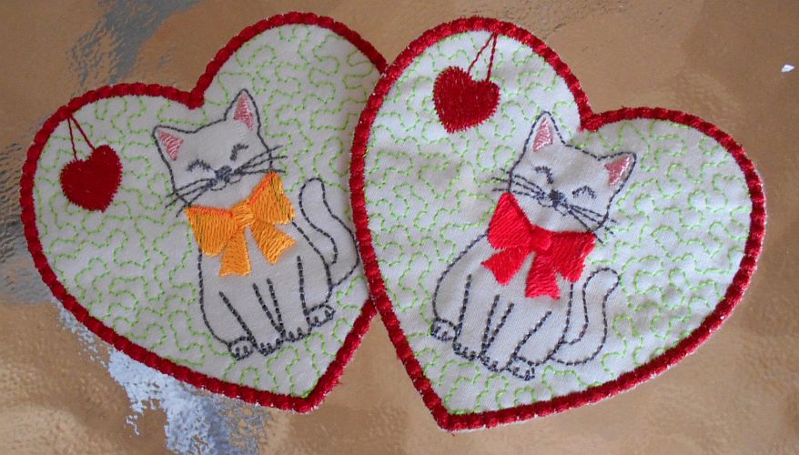 | Outline - gestickte Kätzchen, nur als Kontur | Colorierte Kätzchen-Herzen (mit Aquarell-Stiften) | |