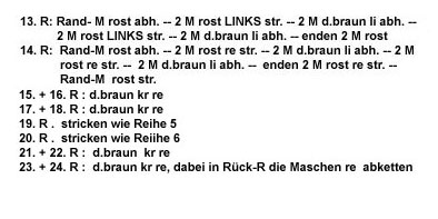 Für die Ärmel - Bündchen werden 48 M aufgefaßt bzw. die aufgefaßten M auf 48 reduziert. Dann die gewünschte Höhe der Bündchen stricken und locker abketten.