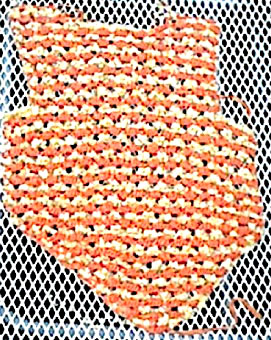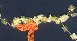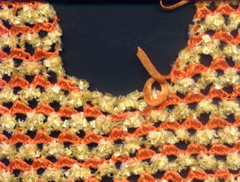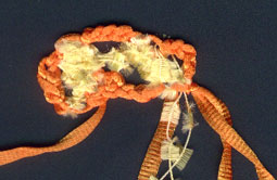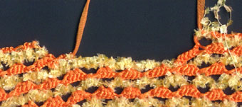 | Mit orange Bändchengarn für die Spitze mit 5 Luftmaschen beginnen, Schlingen auffassen, aus der letzten Luftm 2 Schlingen auffassen = 6 Schlingen, wenden | ||