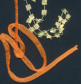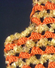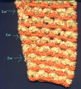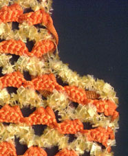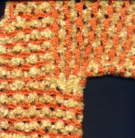 orange-gelb Das Arbeiten mit verschiedenen Materialien beim Crochenit ist sozusagen doppelt effektiv. Man hat ja schon bei gleichen Garnen, aber kontrastreichen Farben den tollen Double-Face - Look. Vorderseite oder Rückseite, das entscheide ich meist erst am Schluß. |
