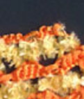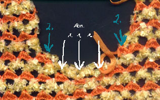 orange: aus der Randm Faden durchholen, 6 Luftm, mit der 6. Luftm 5 Schlingen abmaschen, 6 Luftm, 5 Schlingen abmaschen, 6 Luftm wieder mit einer Kettm zum Bogen schließen, - dabei den gelben Fähnchenfaden mitfassen, damit er schön am Rand liegt zum späteren abschlingen, -- nicht wenden | |