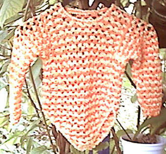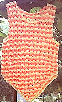 | Für einen rückwärtigen Halsausschnitt könnte man auch die letzte Effekt-Reihe nur über die äußeren je 11 Schlingen häkeln, so gäbe es einen kl. Rückenausschnitt, die mittleren Schlingen dann nur mit 4 Luftm statt 6 abmaschen | ||