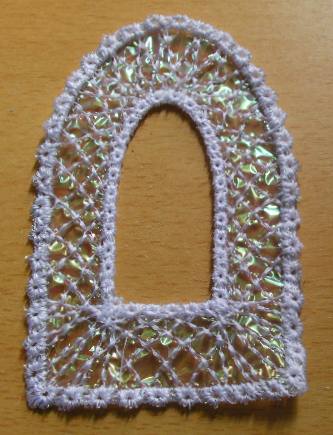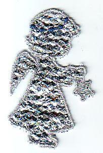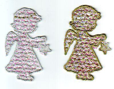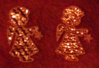 | Die beiden Engelchen sind mit ein und derselben klarsichtigen, irisierenden Opal-Mylarfolie gestickt. Einmal mit Silbermetallic-Garn, rechts mit Goldmetallic-Garn. Der silberne Engel funkelt grünlich, der goldene rosa-grün ... und es funkelt und glitzert sehr viel mehr als es das Bild rüberbringen kann. Der goldene Engel hat 2 Blätter Mylar, d.h. unter dem oberen Blatt Mylar liegt ein Rest vom abgerissenen silbernen Engel. | ||