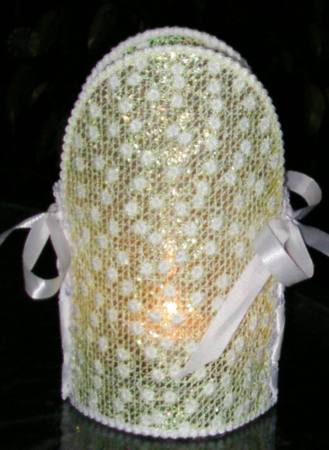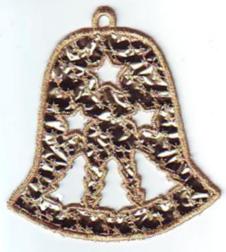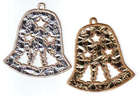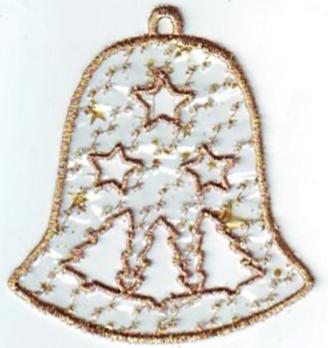 | Das ist kein Lumifol, das ist ähnliche Geschenkpapier-Folie (Cellophan) mit Sternchen drauf. Diese Folie ist allerdings etwas kräftiger als Lumifol, weist aber beim Besticken die gleichen Eigenschaften auf und ist deshalb gerade für Anhängerchen gut zu gebrauchen. Auswaschen des Soluvlies` ist auch dabei kein Problem. Diese klarsichtige Folie gibt es auch holografisch. | Und noch eine Glocke - hier auch auf Sternchen-Folie | |