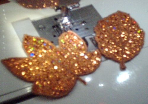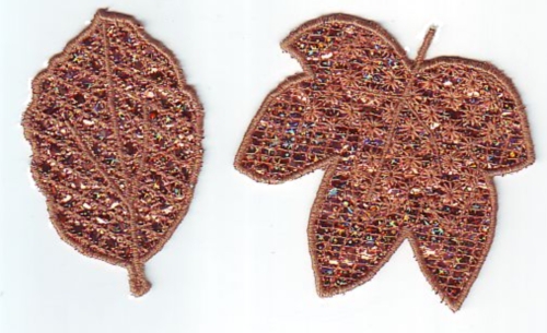 | Diese Blätter sind mit der kupferfarbigen Holografie-Folie gestickt worden | ||