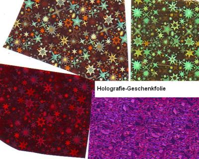 Das ist weihnachtliche Holografie-Geschenkfolie aus einem Drogeriemarkt - oben links kupfer, rechts gold -- unten links rot, rechts lila (ohne Sternchen). Es glitzert so sehr,in rot/orange/gelb/blau/grün/lila, je nach Lichteinfall, dass die ursprünglichen Farben nicht zu sehen sind. Es gibt auch noch silber. | |