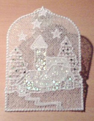 | Mein Winterdorf - unter dem Scanner verschwindet der Glitzer der Mylar-Folie ganz .. | .. aber wenn die Tischleuchte darauf scheint,sieht man, dass die Kirche und die Häuser mit Mylar unterlegt sind. | |
