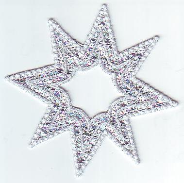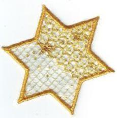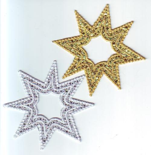 | Diese beiden Engelchen sind nur EINER - sie wurden auf einmal gestickt - die lilafarbene Folie auf das Soluvlies gelegt, obenauf die rote Holografie-Folie (mit dem rot nach oben,es lag also silber auf silber). Ich habe die Folien sachte mit Kleber angesprüht,damit sie nicht verrutschen beim Ansticken, aber es geht auch ohne, da sie recht stabil sind und nicht so weich wie Lumifol, das eher knittert. Gestickt ist mit goldenem Metallicfaden - Unterfaden "normal" weiß. | Engelchen auf Holografie-Sternenfolie --- je nach Bestickung wirkt ein und dieselbe Folie total unterschiedlich | |