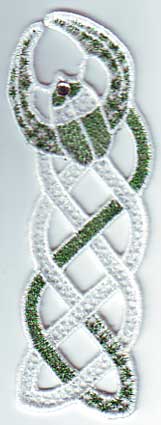 | Schlangenknoten - die grüne Schlange war der "Prototyp" mit "leerem" Auge - bei den anderen habe ich ein stabilisierendes Kreuz in das Auge gestickt, darauf kann nun ein Glitzersteinchen genäht/geklebt werden | Scarabäen auch mit Glitzergarnen | |