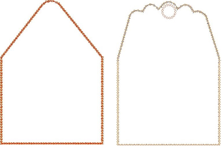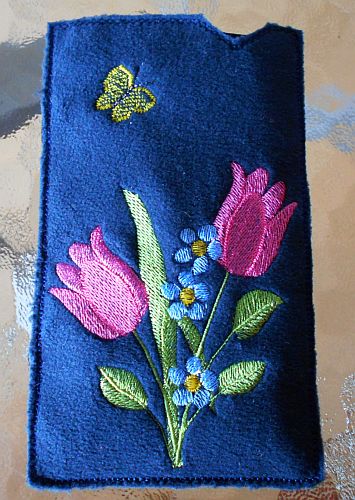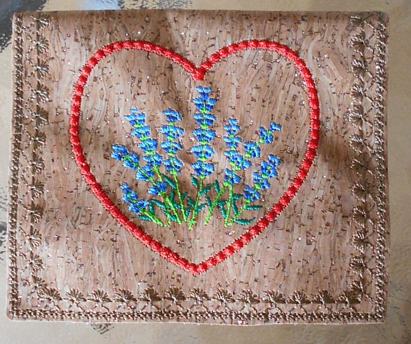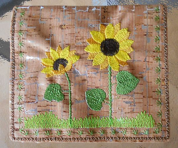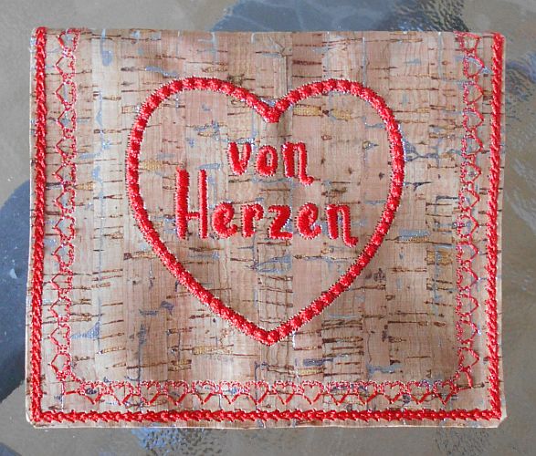 | Diese Kork-Umschläge sind nur mit der Blanko-Datei gestickt worden - keine Nähmaschine nötig, nur alles gestickt, ausschneiden, fertig. | Mit Futter - "muss" nicht sein, sieht aber perfekt aus | |