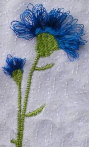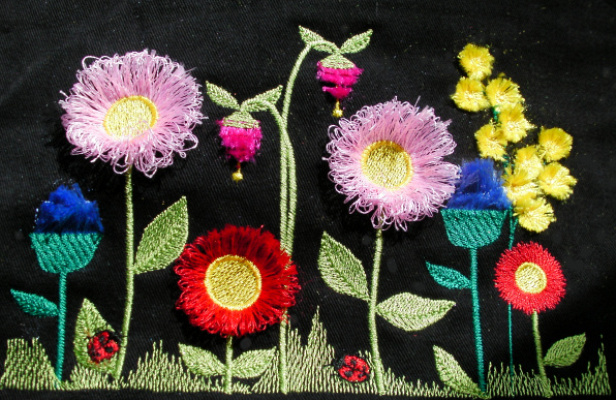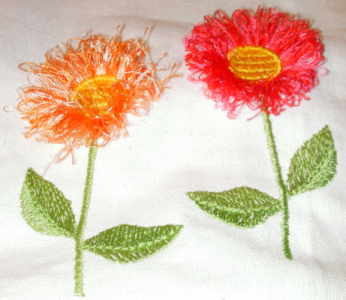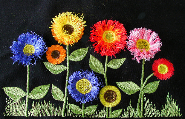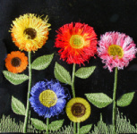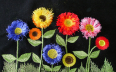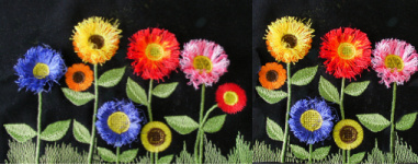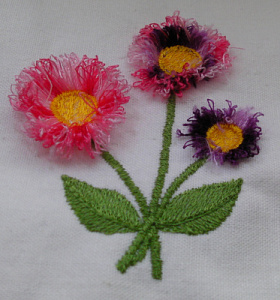 | Manches wird nach dem Sticken verworfen oder verändert, weil der Effekt nach dem Aufschneiden nicht der "gewollte" ist. | Die gleichen Blumen, anders angeordnet. | ||