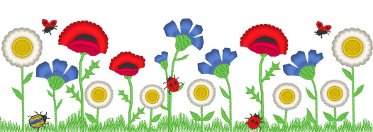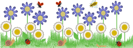 | Beide Muster können problemlos aneinander gesetzt werden, Muster 1 vorne oder hinten ist egal. Die Höhe ist gleich und ist für Muster 2 (10x10) nicht verringert worden. Das "Gras" passt auch aneinander, aber es macht auch nichts, wenn es etwas überstickt. Und wer ein Programm hat, kann ja auch ein Muster spiegeln ... | ||||||||