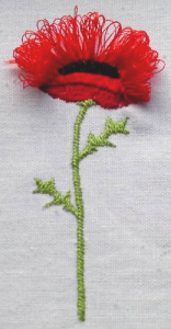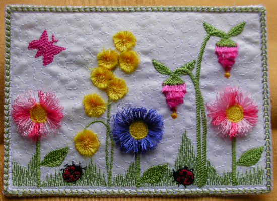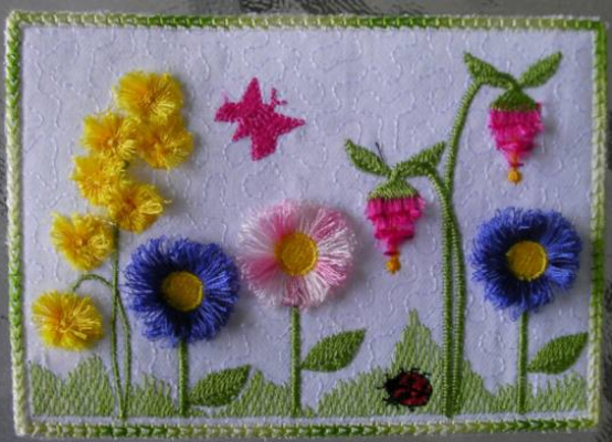 | Der Werdegang dieser AMC-Karte - hier ist die Karte gestickt und schon auf der Rückseite aufgeschnitten. | So sieht es dann aufgewuschelt aus - das passiert allerdings schon beim Hochziehen der Fäden. Ich habe mit Ombré-Garn gestickt | ||
