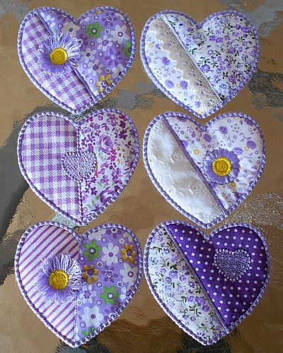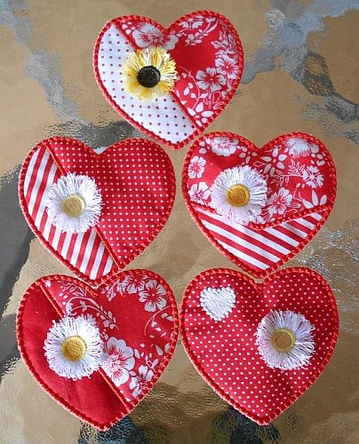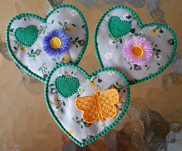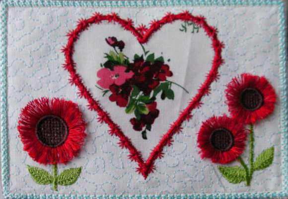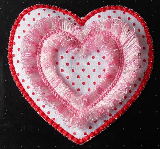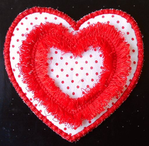 | Warum nur Blümchen?? Auch ein Herz kann man mit Fransen belegen. Dieses ist mit dem Umrandungs-Satinstich (Zickzack) belegt - Höchstbreite 1cm. | Hier sind es 2 einzelne Herzen, die aneinander gelegt sind. Der Effekt ist so ziemlich gleich, außer dass ich beide Herzen mit breiterer Stichbreite belegen kann. | |