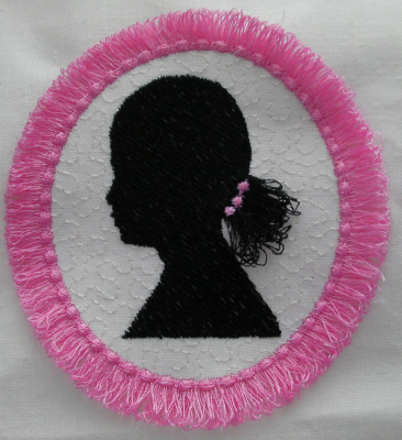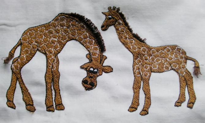 | Hier ein Schattenbild mit Fransenzopf und mit einer Fransenkante | Die Mähnen der Giraffen bieten sich auch dafür an, "Bürsten"fransen zu sticken. Bei der Babygiraffe braucht man allerdings schon eine sehr feine, spitze Schere. | |