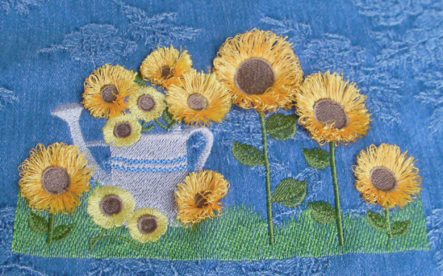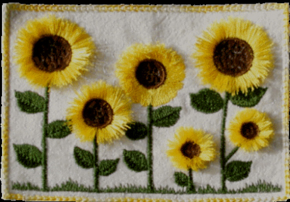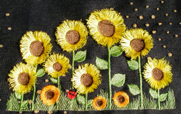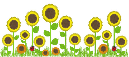 | Sonnenblumen und ein paar verirrte Ringelblumen wachsen um die Wette | Auch bei diesem Muster gibt es geschnittene und ungeschnittene Blüten | |||||||||