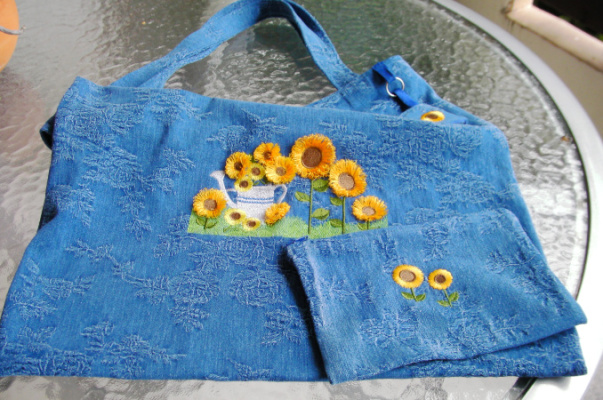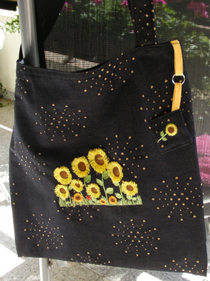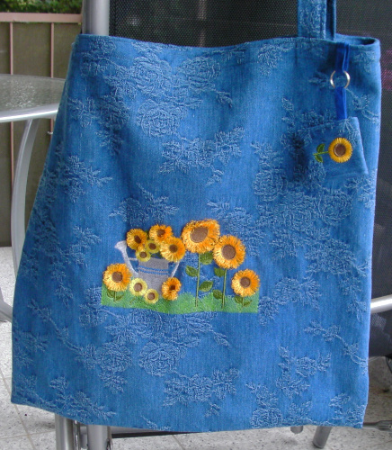 | Beuteltasche aus einem dunkelbraunen Jeansstoff mit löchrig-gewebten gelben Punkten | Mit Rosen plastisch gewebter Jeansstoff - auch da machen sich andere Blumen gut drauf :) | |||||||||