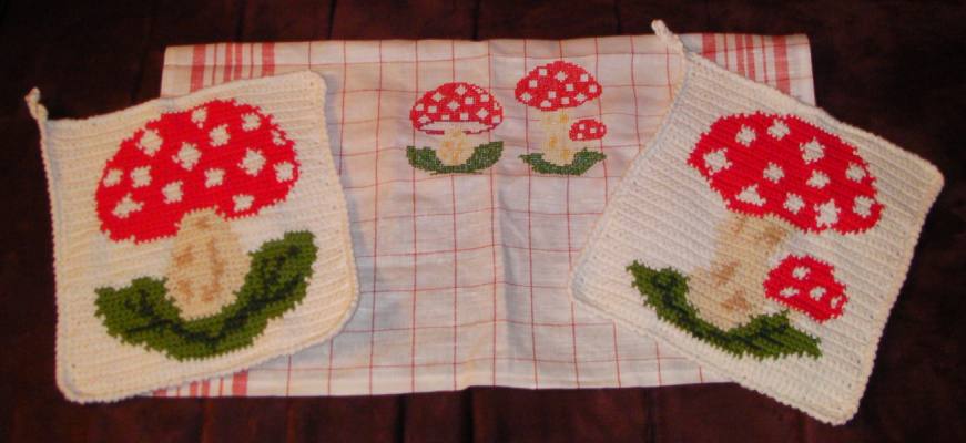 Ab und an schaue ich mich mal auf meinen Seiten um. Es sind inzwischen so viele, dass ich manchmal selbst erstaunt bin, was im Laufe der Zeit entstanden ist ... und wieviel eigentlich zum Verbessern und Bearbeiten noch "auf Halde" liegt. Aber bei jedem Fieber kommt dann noch mal ein neuer Schub hinzu, neue Ideen, die ausgeführt werden wollen. So bleibt dann vieles unberührt im Ordner liegen. Die Kreuzstichpilze haben ihr "Sein" dem Umstand zu verdanken, dass ich eeeendlich die Pilze als Topflappen häkeln wollte. Und da diese Muster im Cross Stitcher entstehen, habe ich gleichzeitig auch Kreuz-Stickmuster. Mit einem bißchen Nacharbeiten, und nach dem ersten Sticken auch etwas Umändern, sind endlich mal wieder Stickmuster für den "Obst- und Gemüsekorb" entstanden. Was lange währt .... |