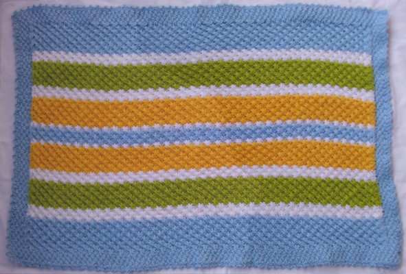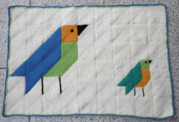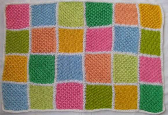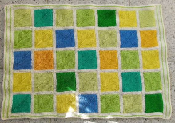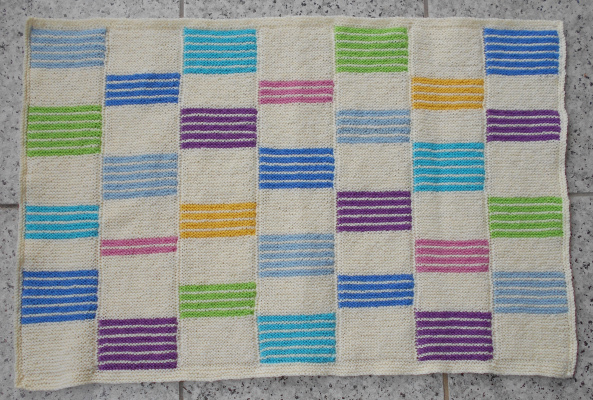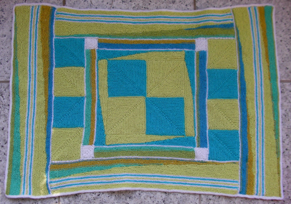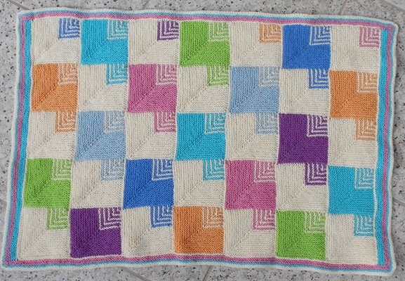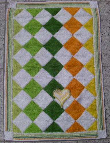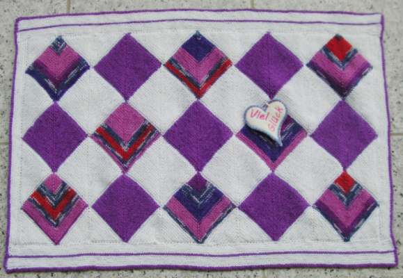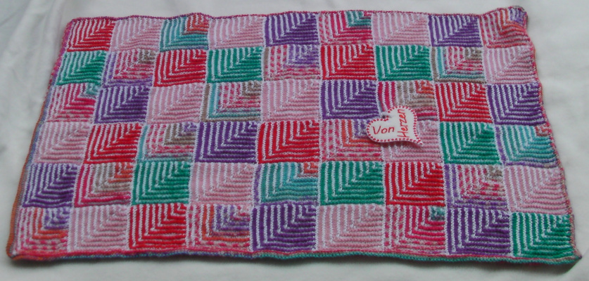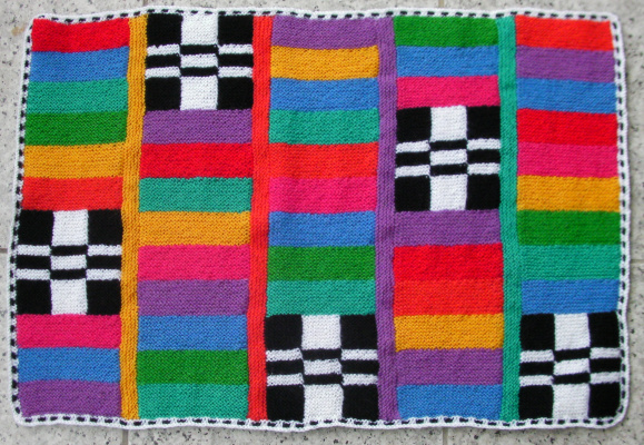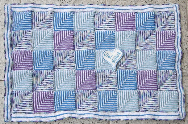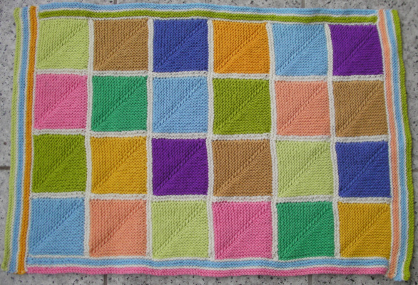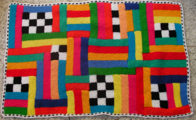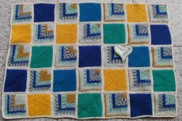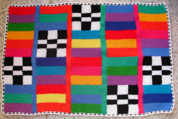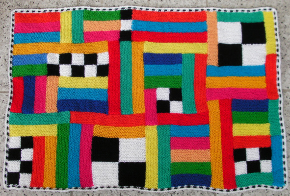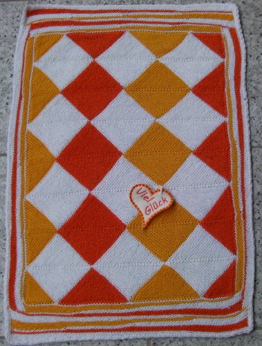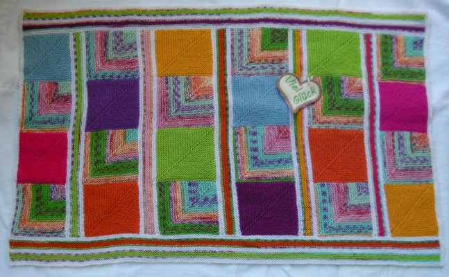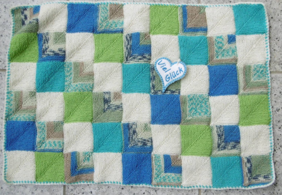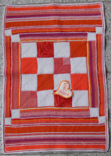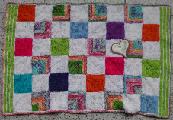 Muß es immer Baby-Rosa oder -Blau sein? Vielleicht gibt es ja auch Frühchen-Eltern, die kräftige Farben mögen - Colour-Blocking ist nun mal fröhlich bunt. Aufgelockert wird es durch die schwarz-weißen Kästchen und die schwarz-weißen Hebemaschen am Rand . | Für mich entsteht ein Dilemma - jetzt würde ich gern weiterstricken. Eine Kniedecke oder sogar eine große ... das Muster reizt zum Weiterstricken, in jede Richtung, einfach weiter und weiter ... und dann alles zusammenfügen. | |