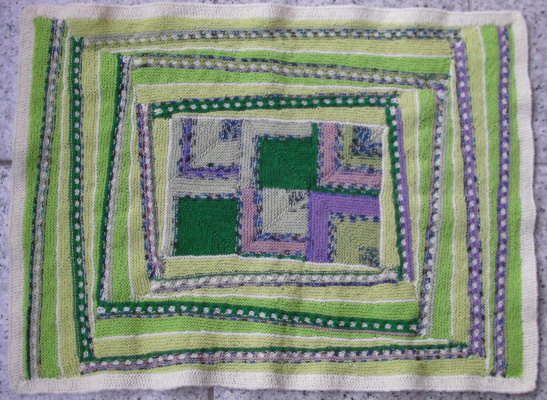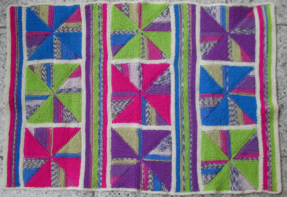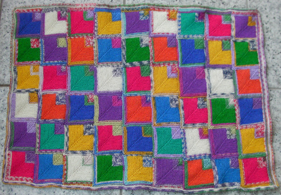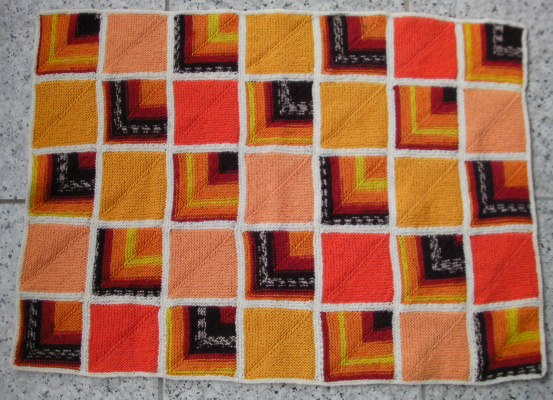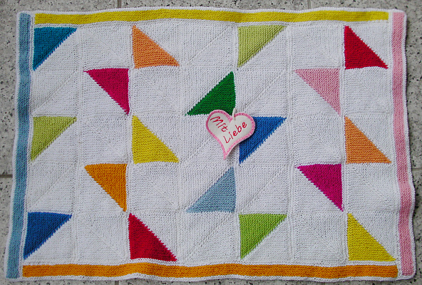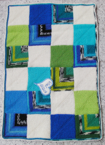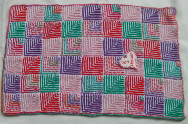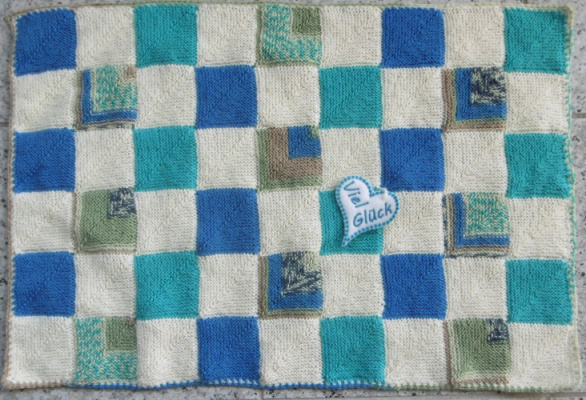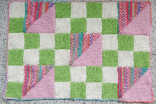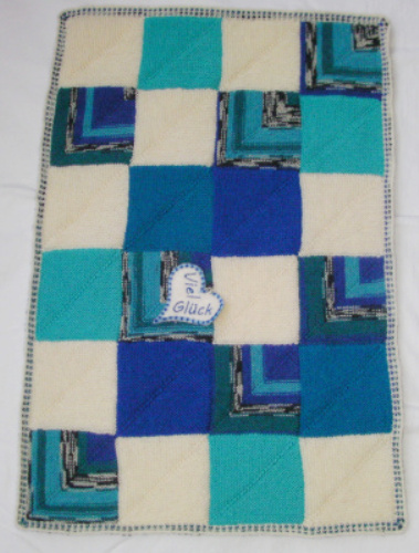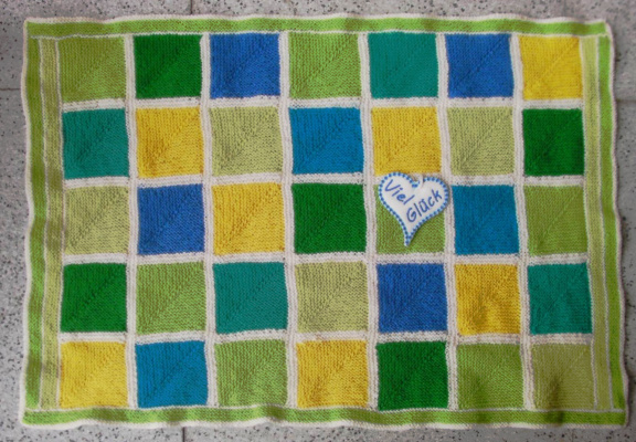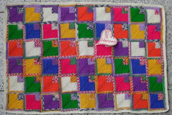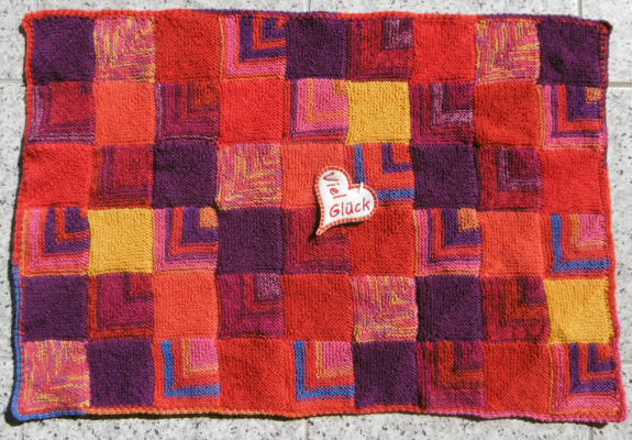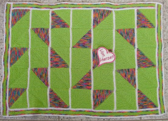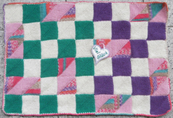 Noch einmal Schattenstrickerei. Die letzte Frühchendecke für dieses Jahr. | Zum Schluß eine Gemeinschaftsarbeit von meiner Enkelin und mir: Sabrina hat als Strickanfang die "bunten" Patches gestrickt, von mir kamen die unifarbenen und das Zusammenfügen. Das allererste Patch wurde ein Dreieck, ab dann hat es super geklappt, wie man sieht. |