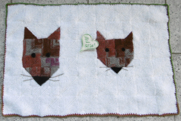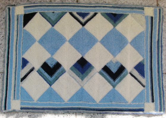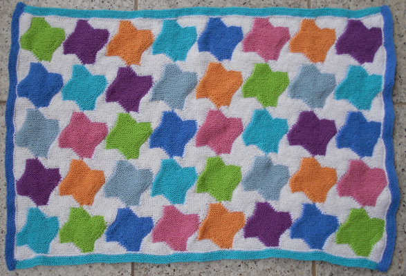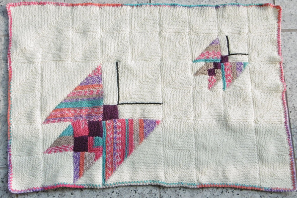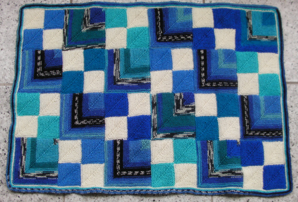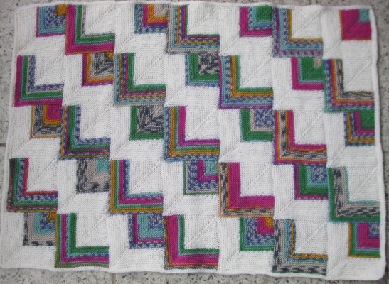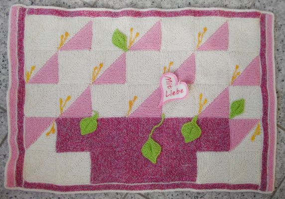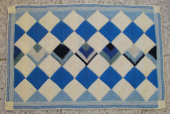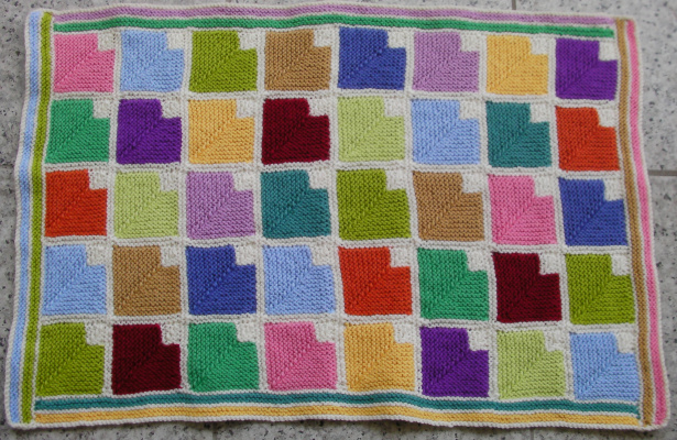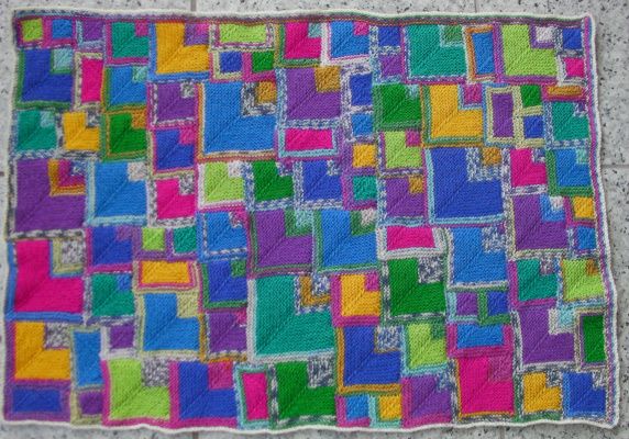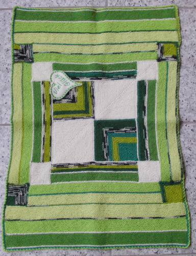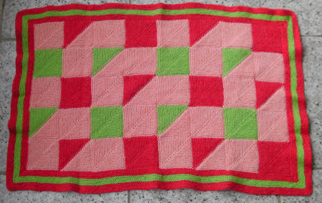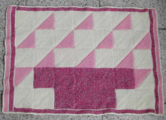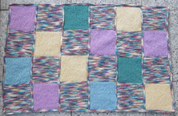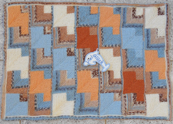 Noch einmal Schattenstrickerei. Die letzte Frühchendecke für dieses Jahr. | Zum Schluß eine Gemeinschaftsarbeit von meiner Enkelin und mir: Sabrina hat als Strickanfang die "bunten" Patches gestrickt, von mir kamen die unifarbenen und das Zusammenfügen. Das allererste Patch wurde ein Dreieck, ab dann hat es super geklappt, wie man sieht. |