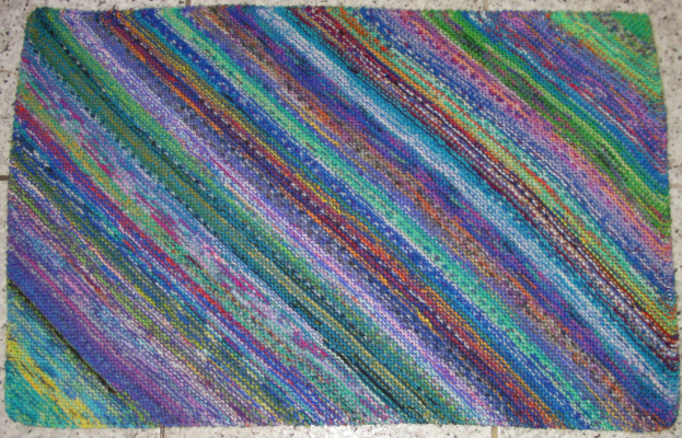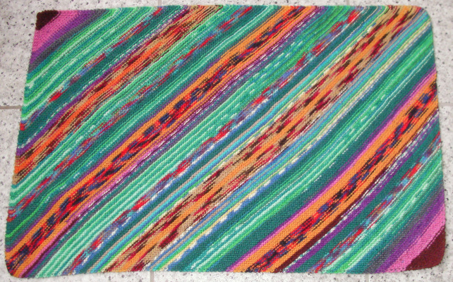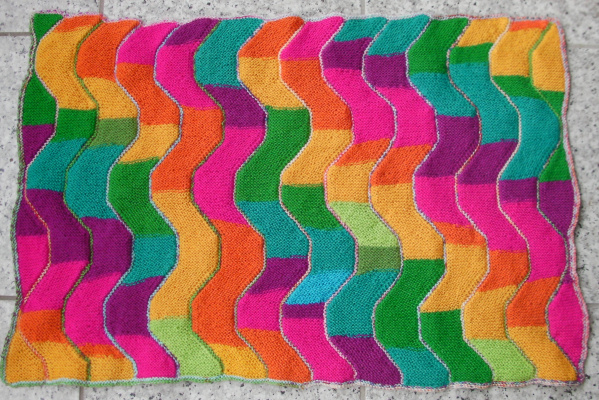 Pfingsturlaubs-Strickerei | Da die letzten 2 Tage des Urlaubs noch Lust zum Stricken und Tüfteln war - aber auch nur noch die kräftigen Farben vorhanden waren - enstand das bunte "Gewelle". Meine Enkelin sagte zwar, dass die gebogene Kante schön wäre als Abschluss, aber ich denke, eine halbwegs gerade Kante erfüllt den Zweck etwas besser. | |