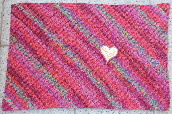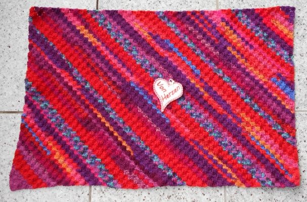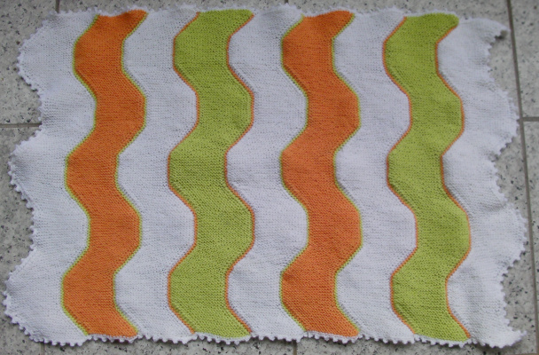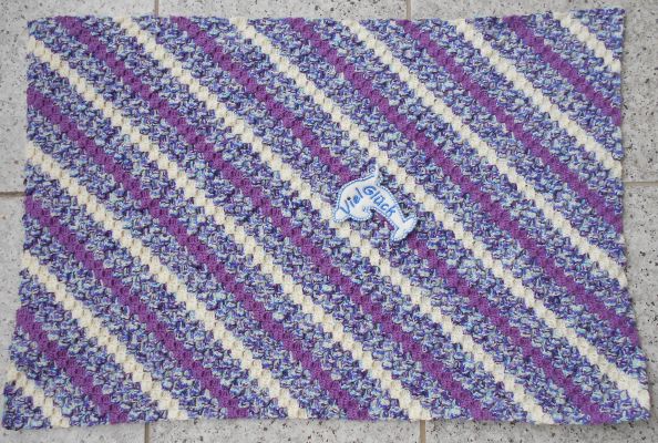 Auch rosa-bunte-wilde Reste müssen verarbeitet werden - mit ein paar (gewollten) Löchern drinnen. | Nun ist die 2. Wellen-Decke doch wellig geblieben - allerdings reichen hierfür keine Reste. | |