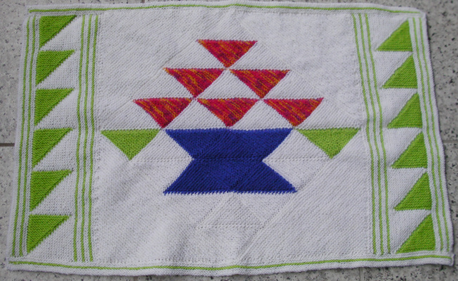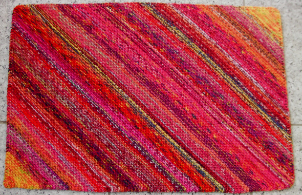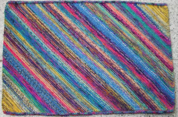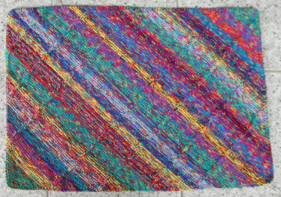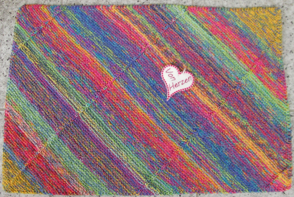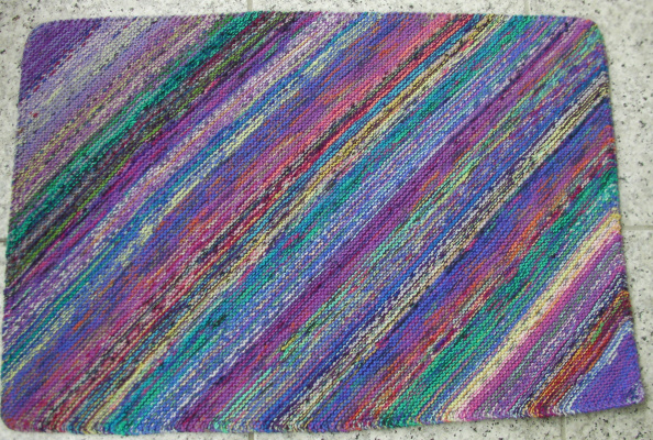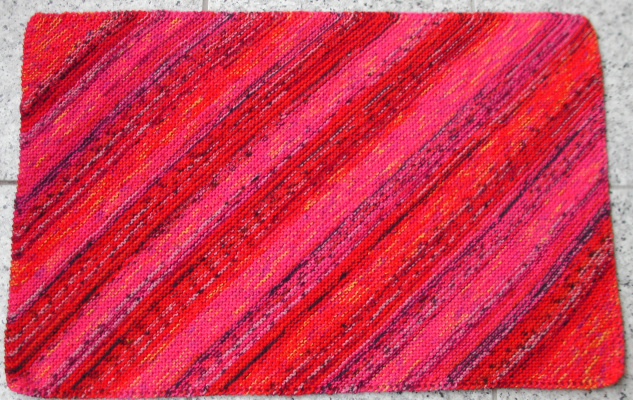 Ein Deckchen in Schattenstrickerei. | Aus einem anderen Blickwinkel kann man die unterschiedliche Struktur sehen. Beim gemusterten Garn ist es nicht so offensichtlich wie bei den 3 kräftigeren Farben. Es wird nur mit rechten und linken Maschen "gespielt". | ||