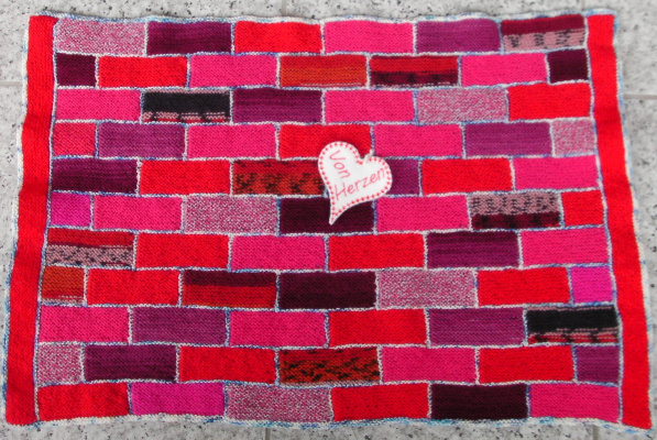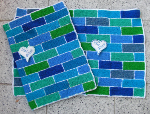 Warum eigentlich immer neue Muster "erfinden" wollen? Jetzt ist es mal ein ca. 25 Jahre altes Ziegelsteinmuster. Darin kann man sehr gut die kräftigen Rot-Töne unterbringen. Mal sehen, was die Blau-Grün-Kiste hergibt .... | Und zwar dieses .... in die "Fugen" habe ich bei einer Decke Reste des weiß/blau-gesprenkelten Garnes der roten Decke verstrickt, bedruckte Garne in Grün/Blau hatte ich nicht ... so sind es alles unifarbene Ziegelsteine geworden. | |