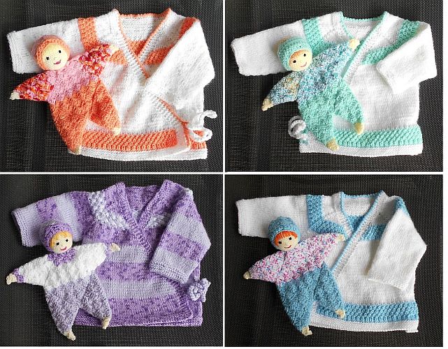 | Alle 4 Jäckchen mit einem "Muckele" - darin sind die Restgarne der 4 Wickeljäckchen verhäkelt | ||
