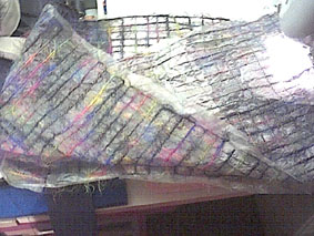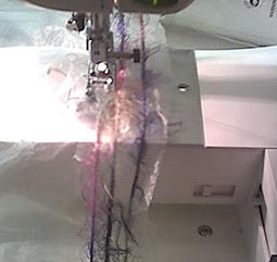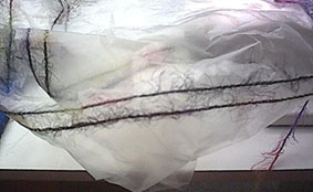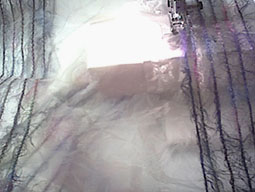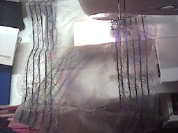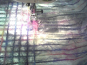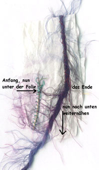 | Nun kann es losgehen! Ich nehme ein Stück wasserlösliche Folie, für einen kurzen, breiten Schal ca. 90cm ->>, 20 25cm breit. Wenn der Schal noch einmal umgeschlungen werden soll, sollten es schon 110-120cm sein. (für den gezeigten Möbius-Schal habe ich 90cm lange und 30cm breite Folie genommen). Die Wolle wird zuerst in Längsstreifen aufgenäht, mit einem Zickzackstich von 3,5mm Länge und 3,5mm Breite. Wenn man am Ende der Bahn angelangt ist oder kurz davor, näht man normalerweise Anfangs- und Endfaden ein bisschen übereinander. Aber hier hält man die Machine an, denn jetzt kommt der TRICK mit der MÖBIUS-Drehung : ich lege den Anfang der Bahn nicht direkt an das Ende an, wie man es normalerweise tun würde, um eine Runde zu bekommen ich drehe jetzt einmal die Bahn so, daß der Anfangsfaden plötzlich unter der Folie und auf der linken Seite zu sehen ist. Dann klebt man die Bahn etwas zusammen und sie ist nun eine Runde. |