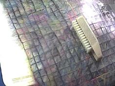 | Hab ich alles genäht, bürste ich dann noch ein bisschen die eingenähten kurzen Fasern aus der Zickzacknaht, damit der Schal schön flauschig wird. Aber auf beiden Seiten, denn die Fäden sind ja rundum auf beiden Seiten genäht. |