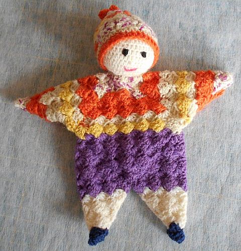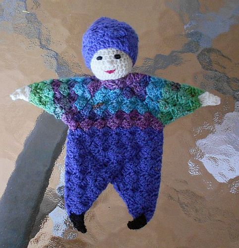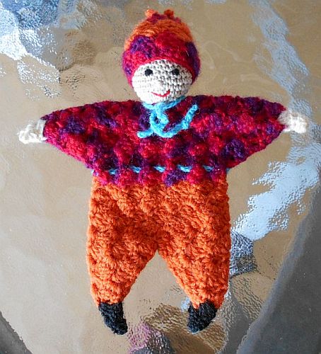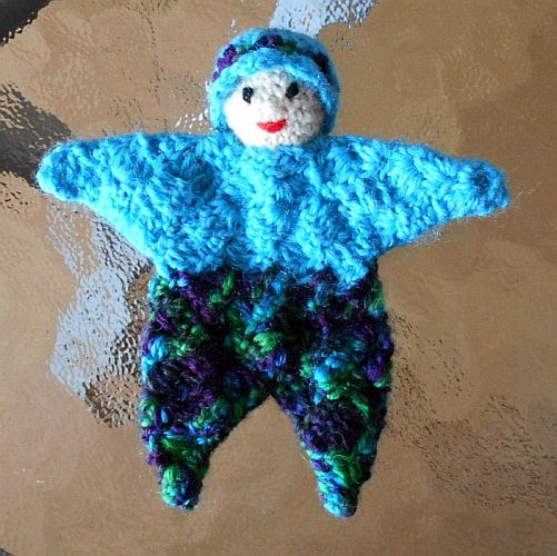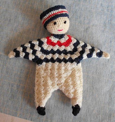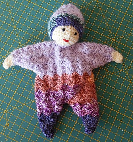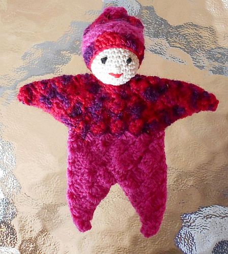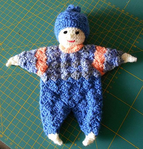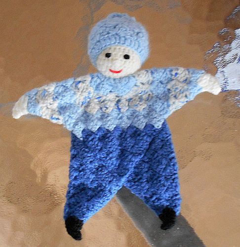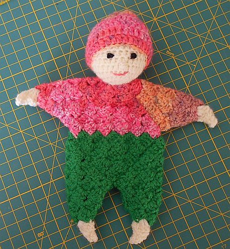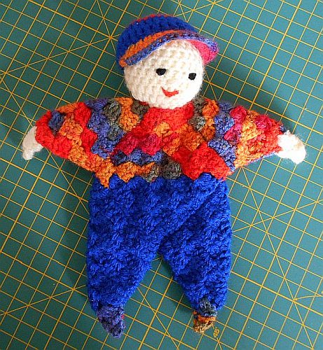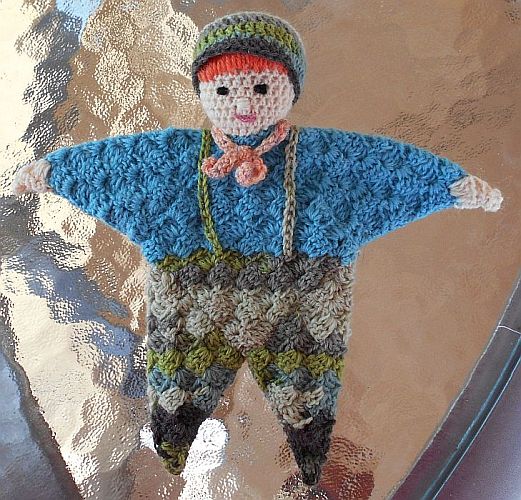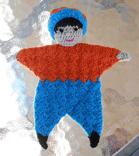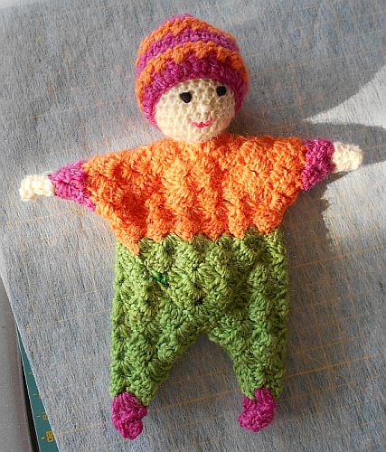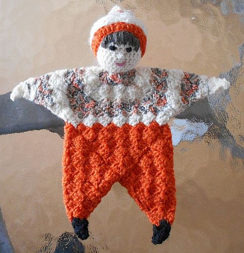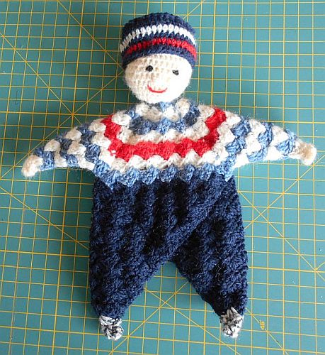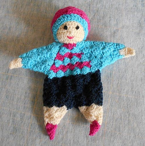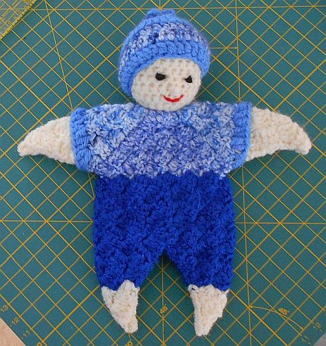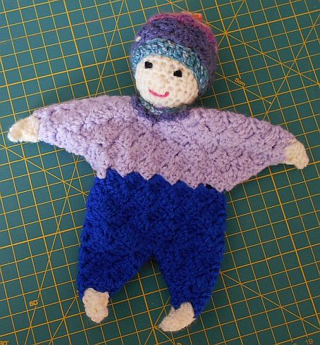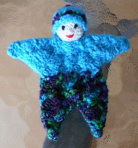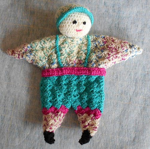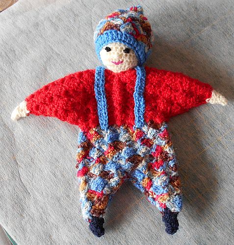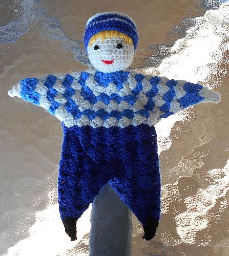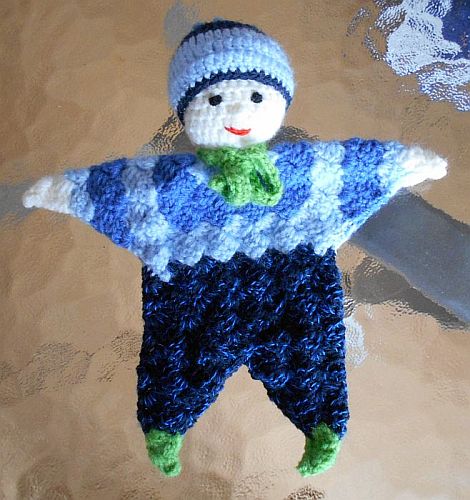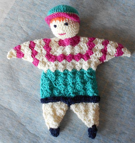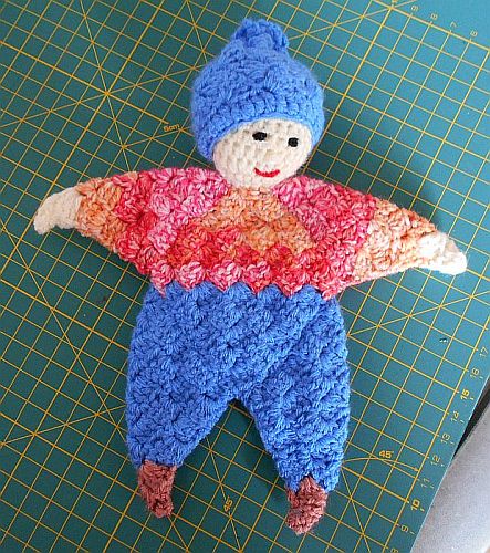 Dieser Muckele-Junge hat eine Pudelmütze auf - eine Häkelprobe findet eine gute Verwendung | ||