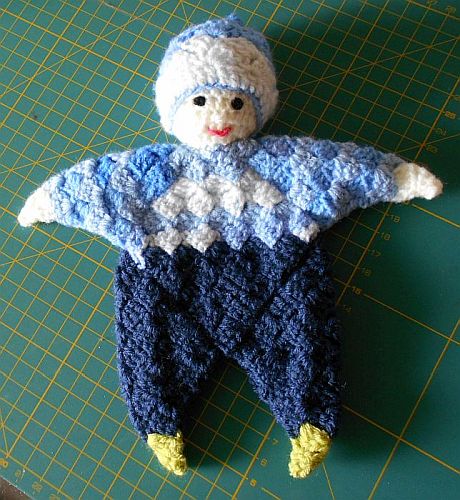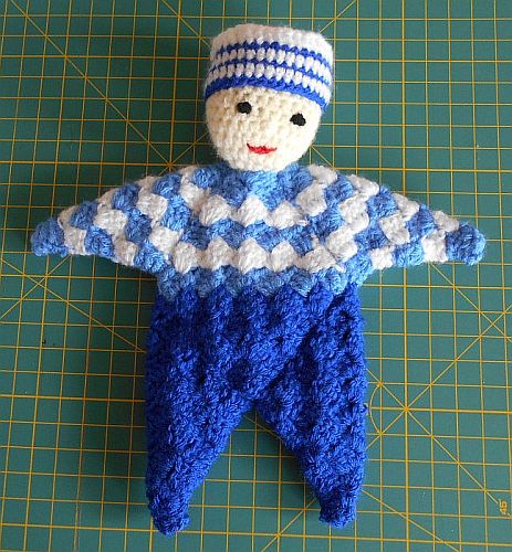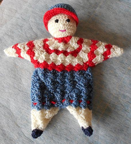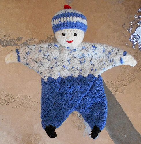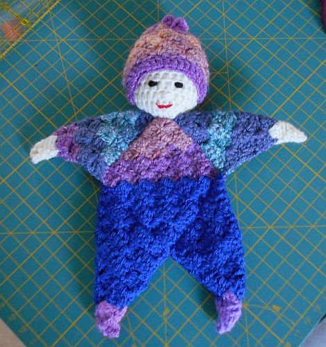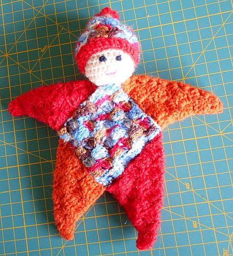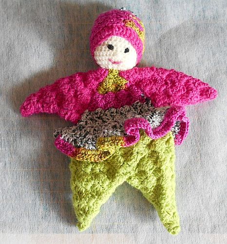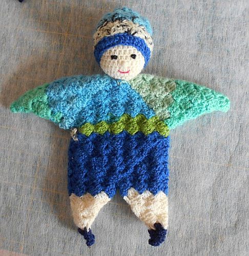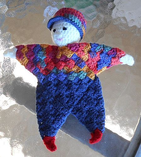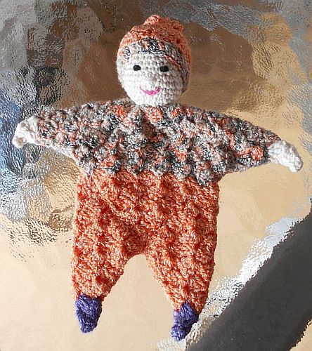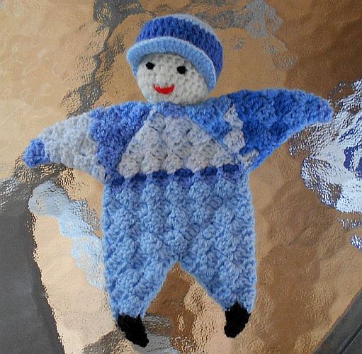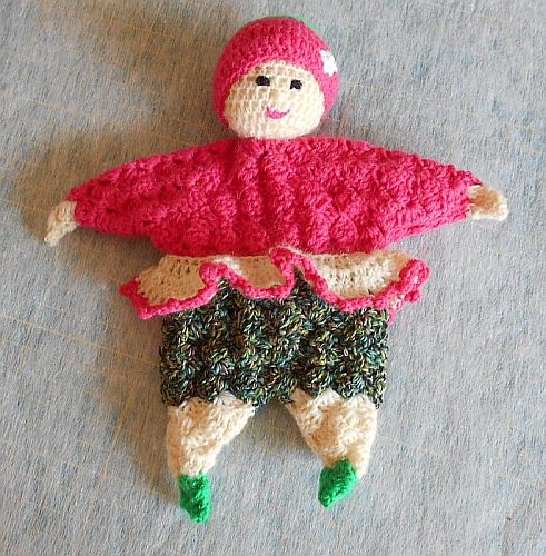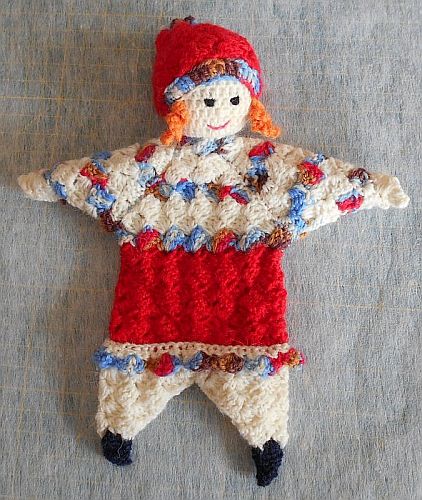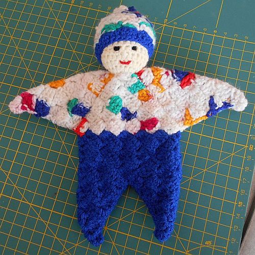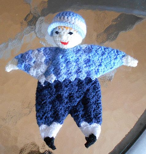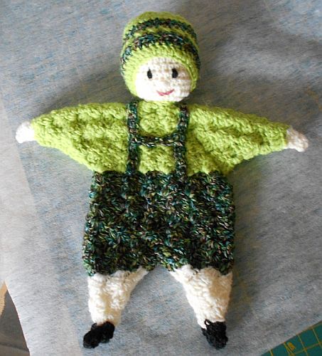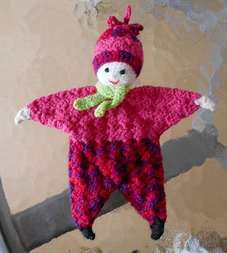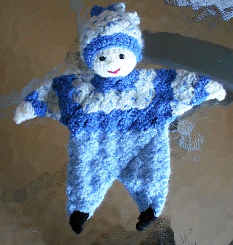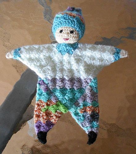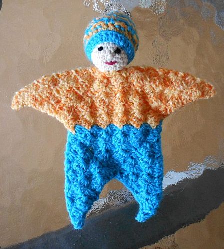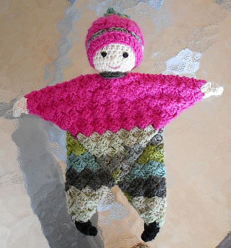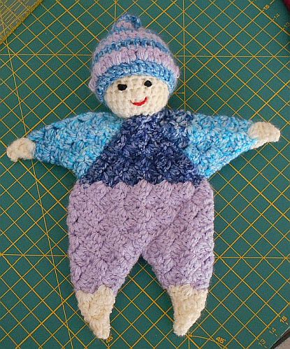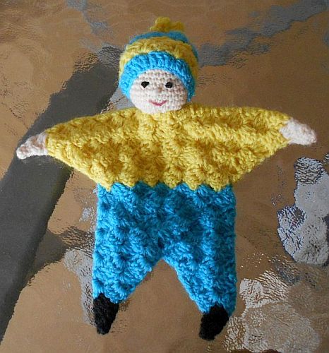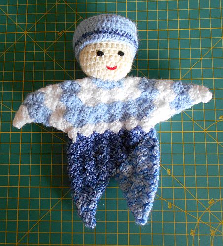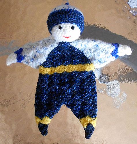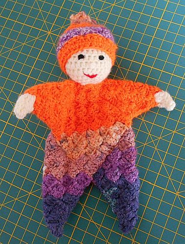 Dieser Muckele-Junge hat eine Pudelmütze auf - eine Häkelprobe findet eine gute Verwendung | ||