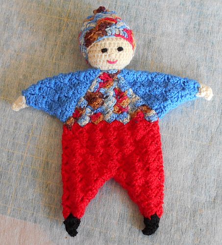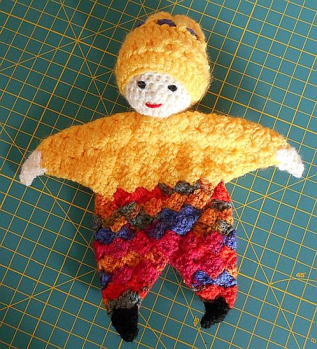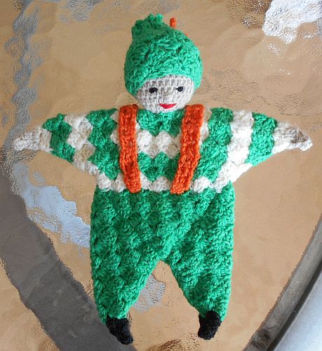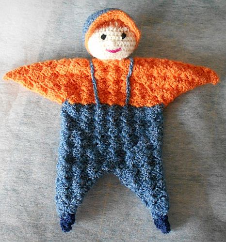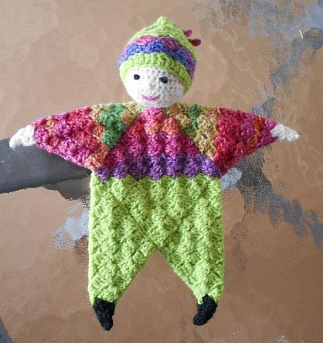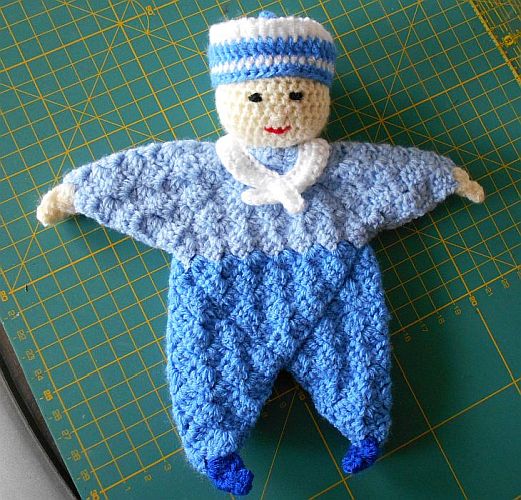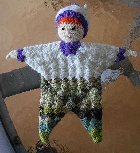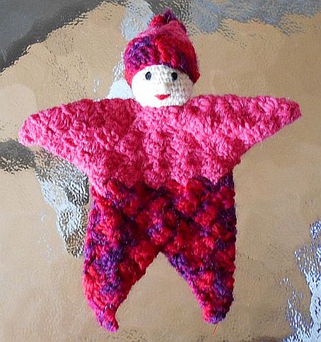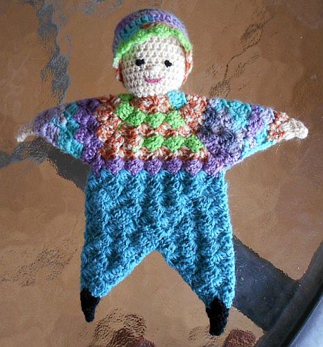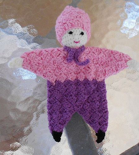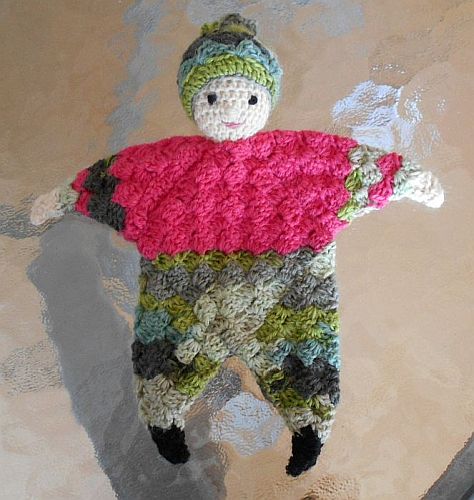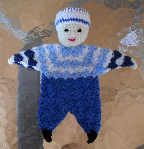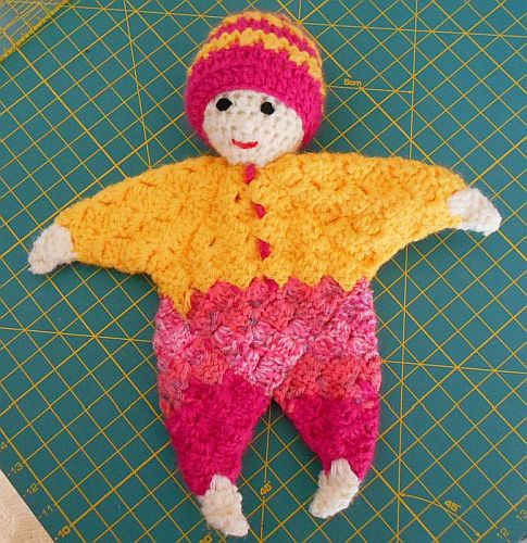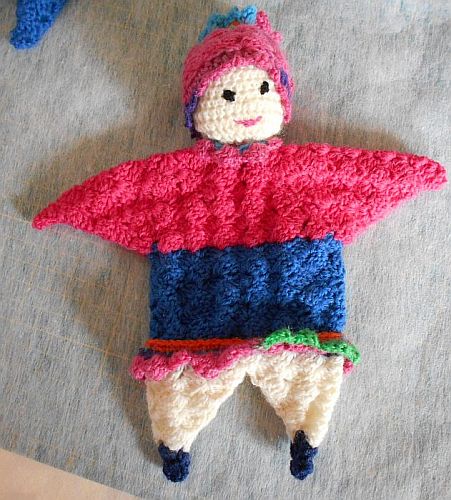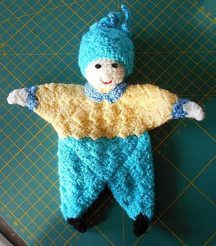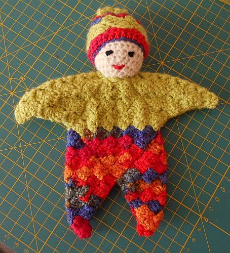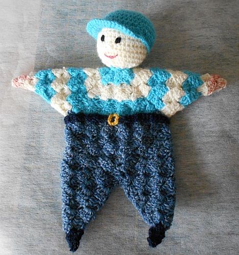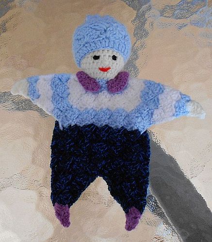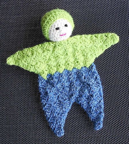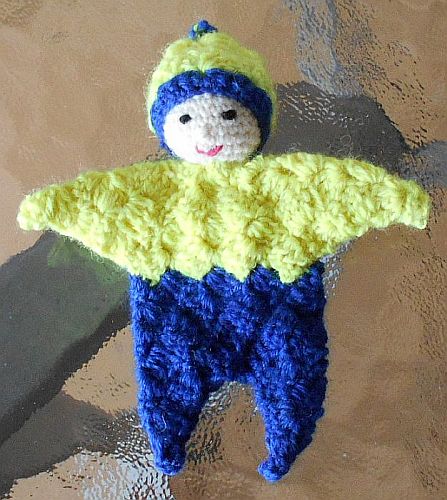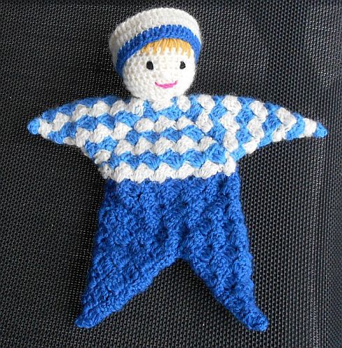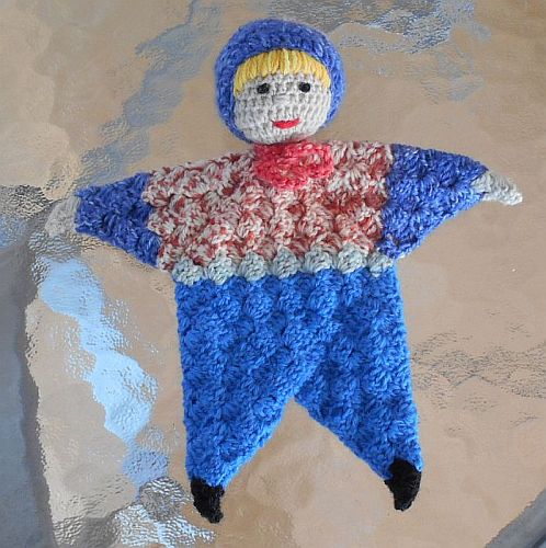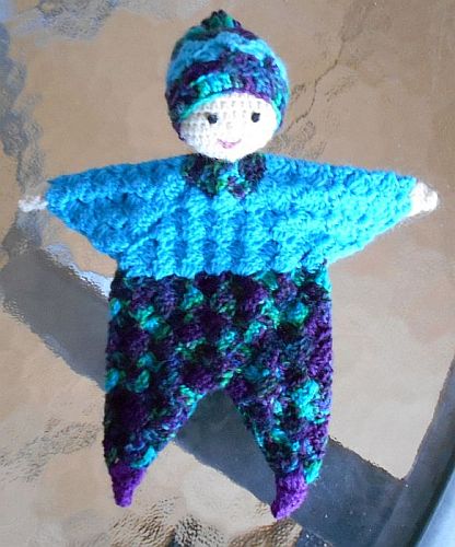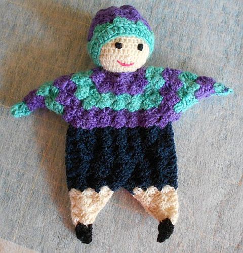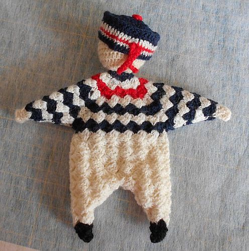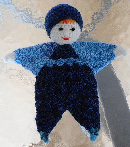 Dieser Muckele-Junge hat eine Pudelmütze auf - eine Häkelprobe findet eine gute Verwendung | ||
