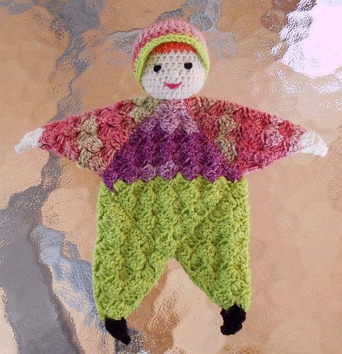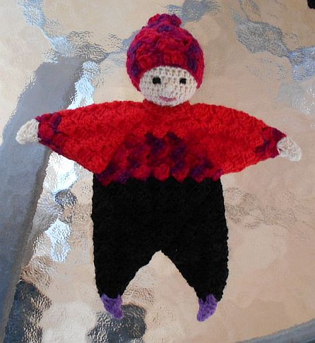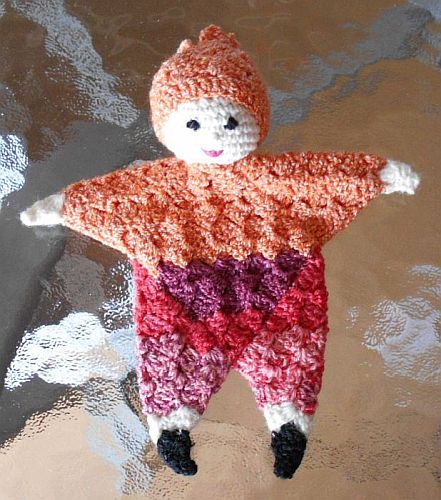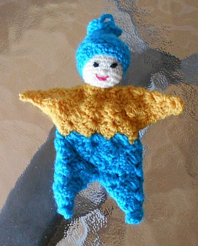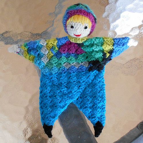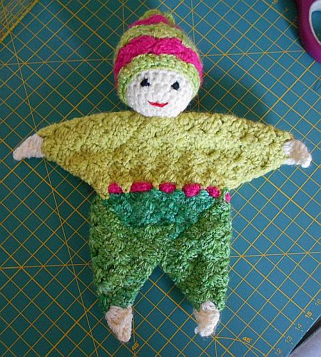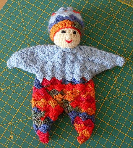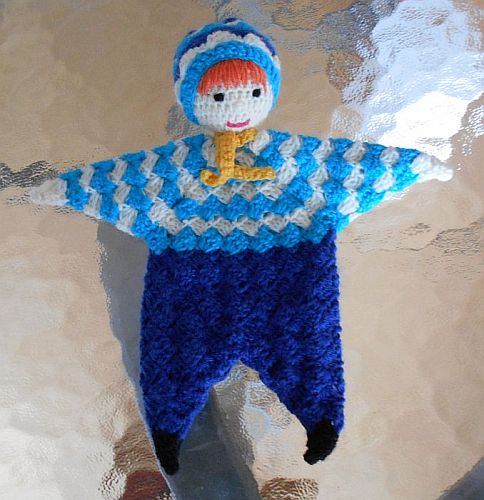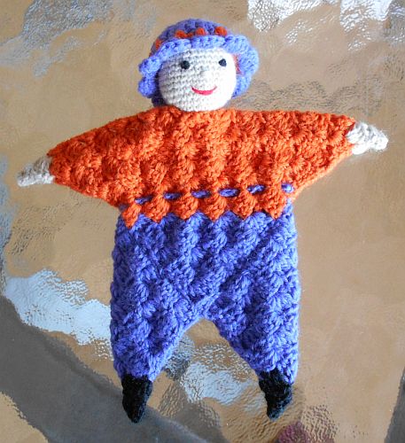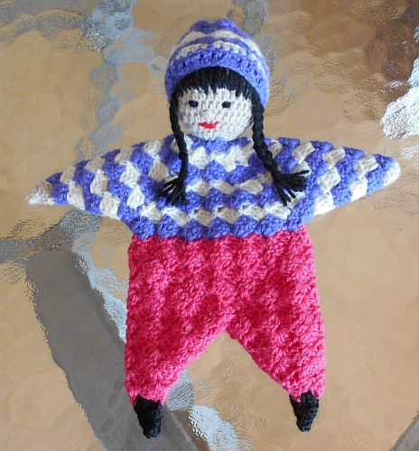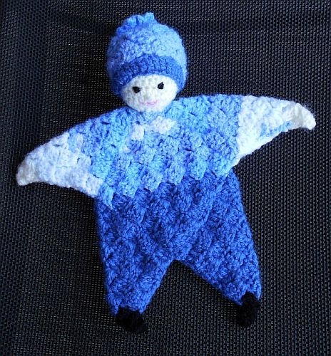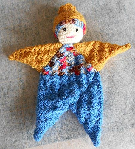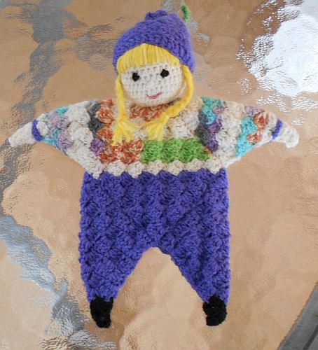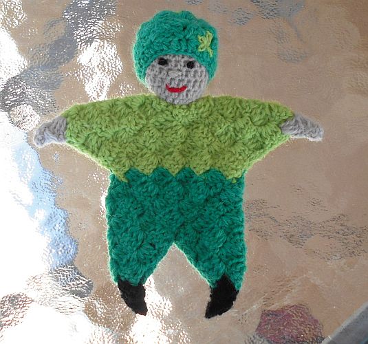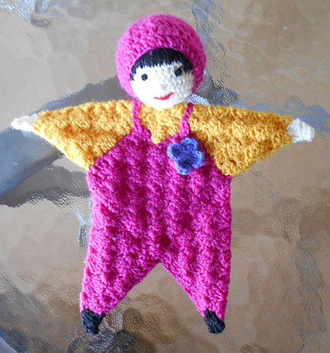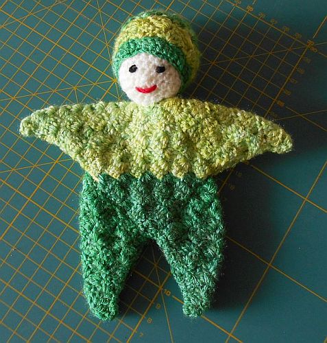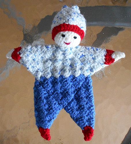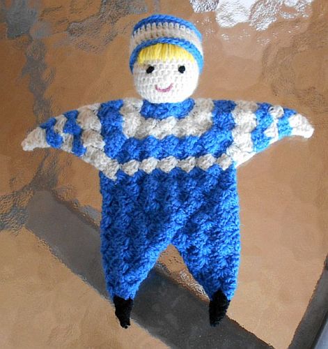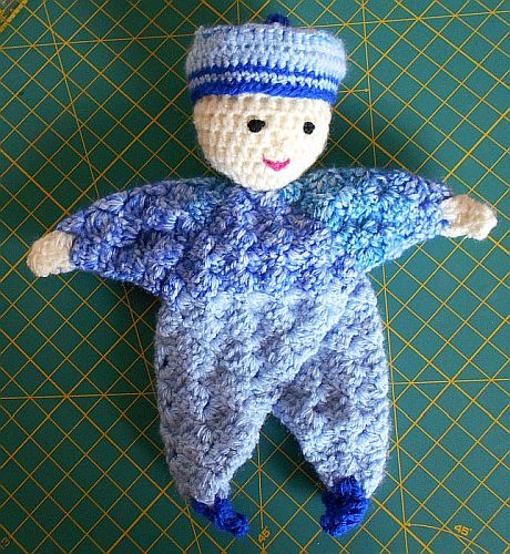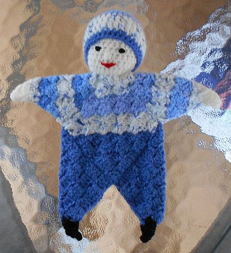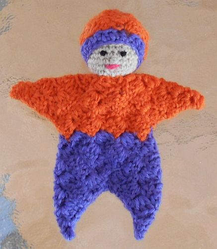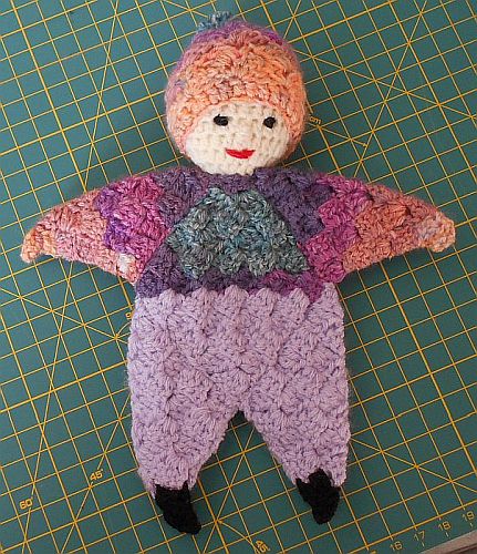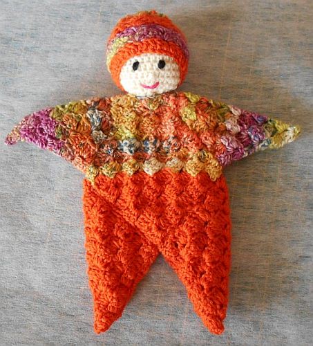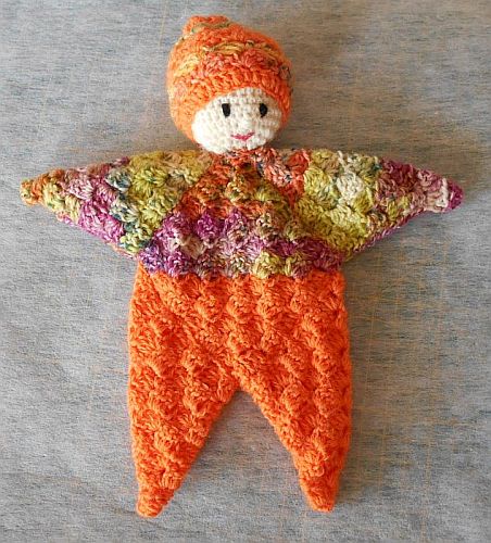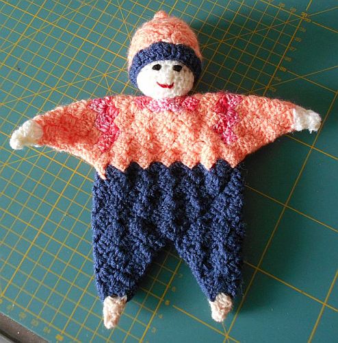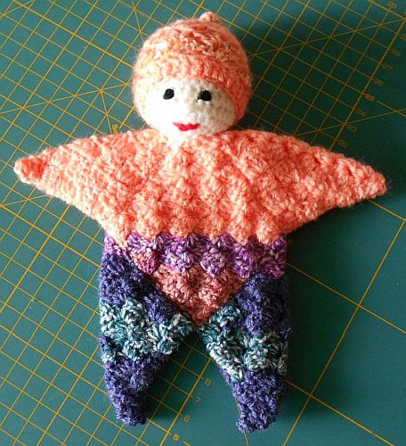 Dieser Muckele-Junge hat eine Pudelmütze auf - eine Häkelprobe findet eine gute Verwendung | ||