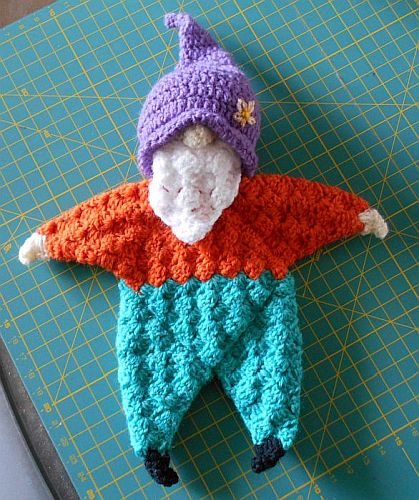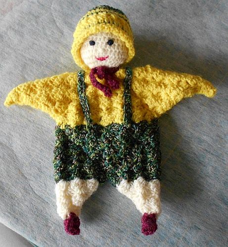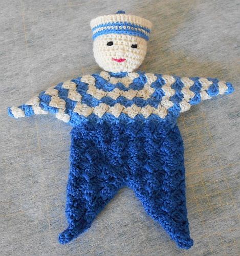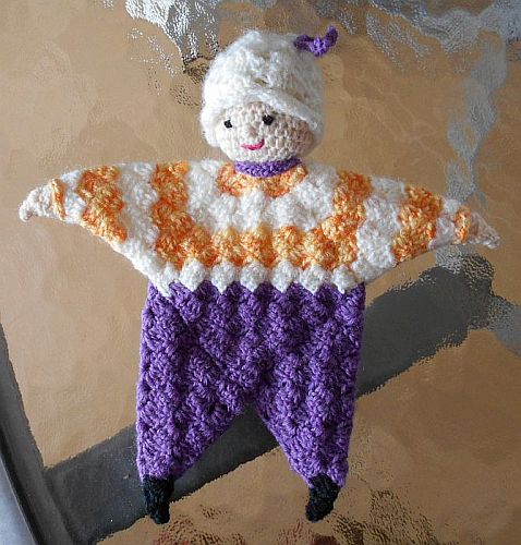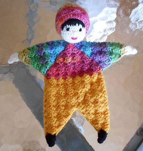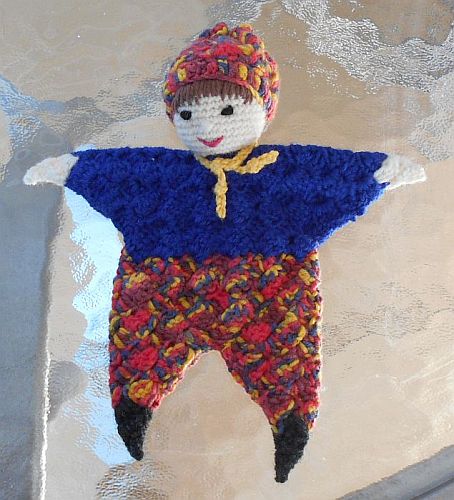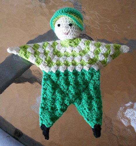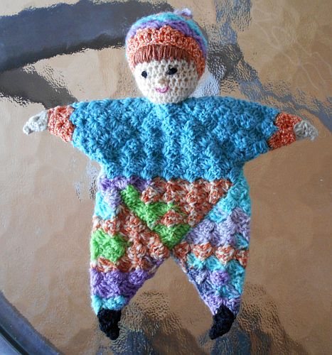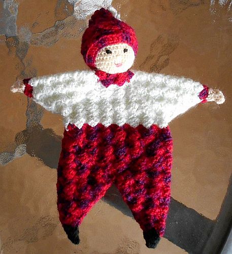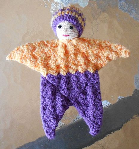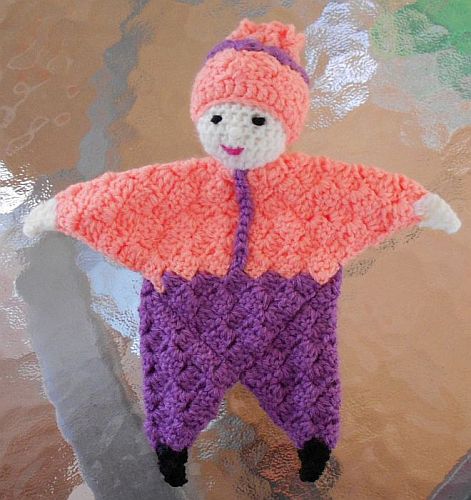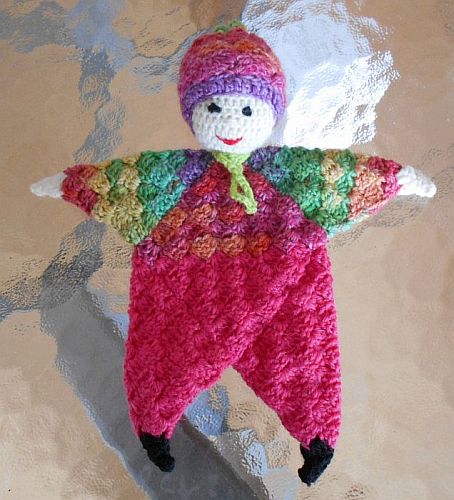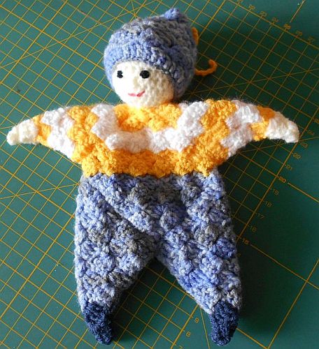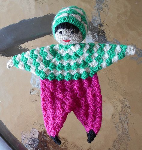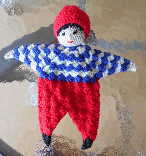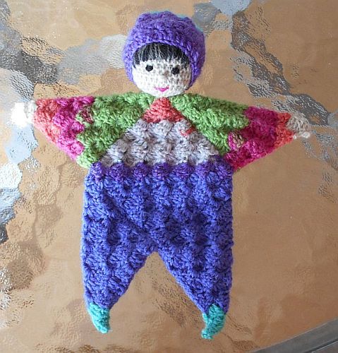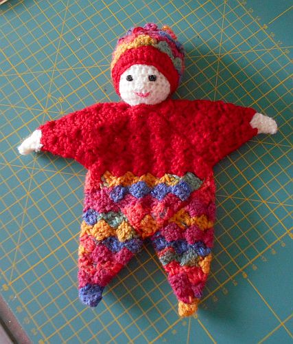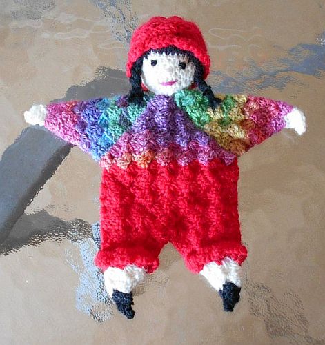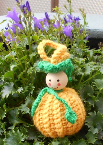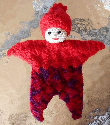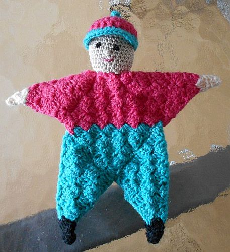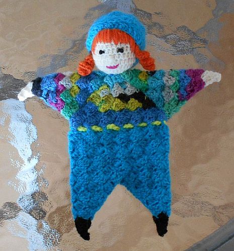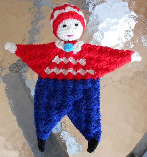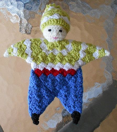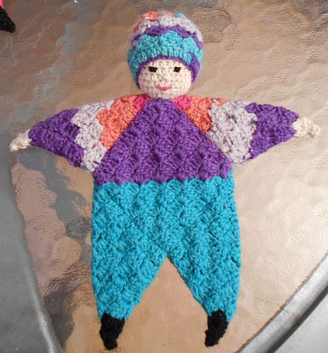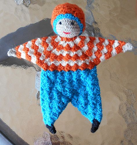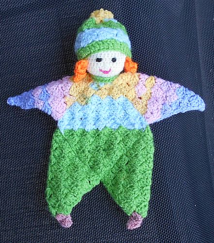 Dieser Muckele-Junge hat eine Pudelmütze auf - eine Häkelprobe findet eine gute Verwendung | ||