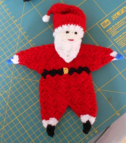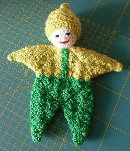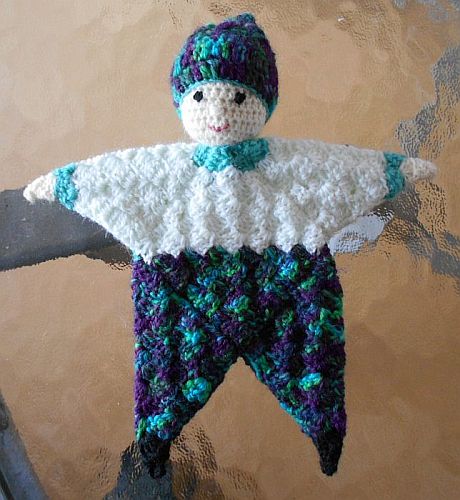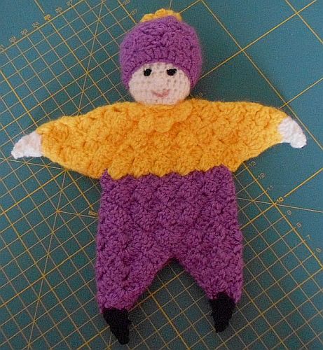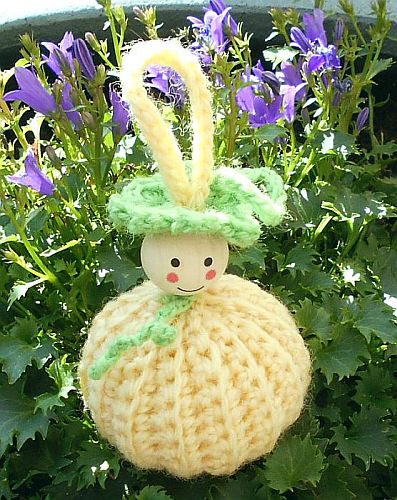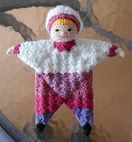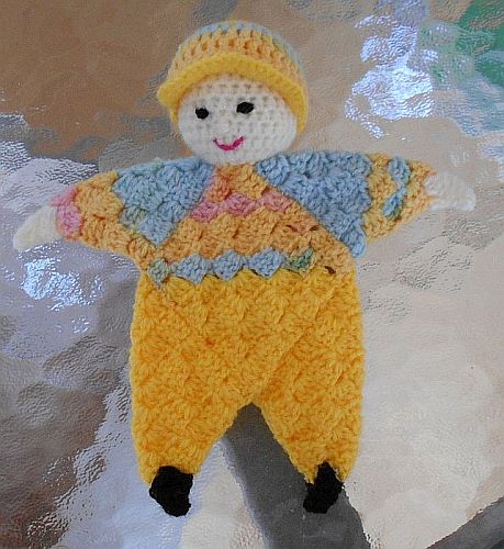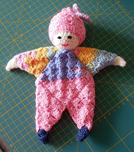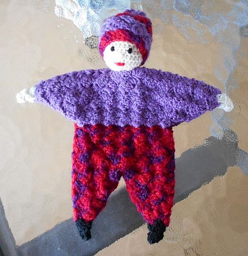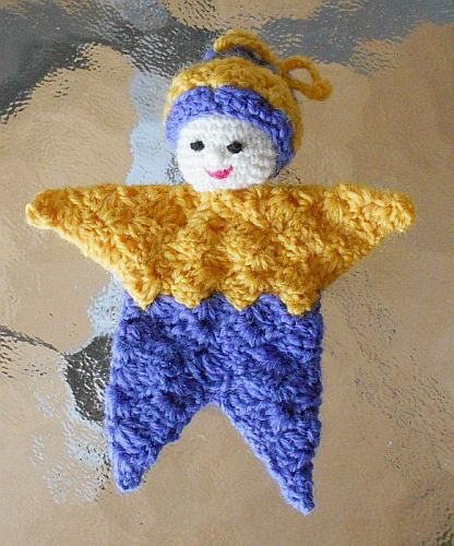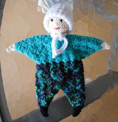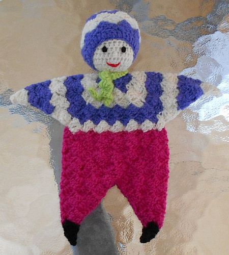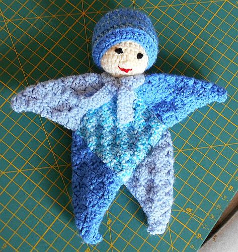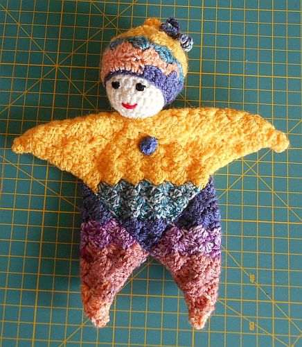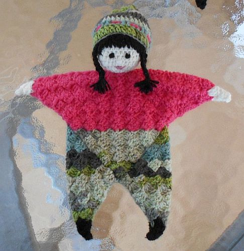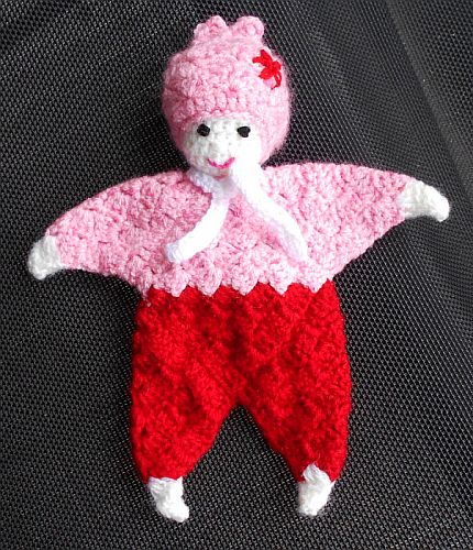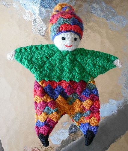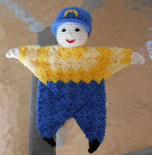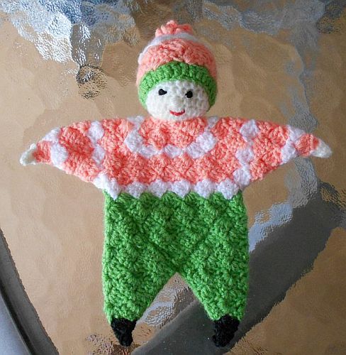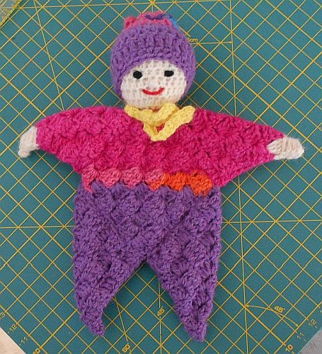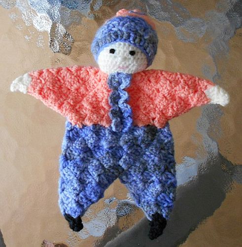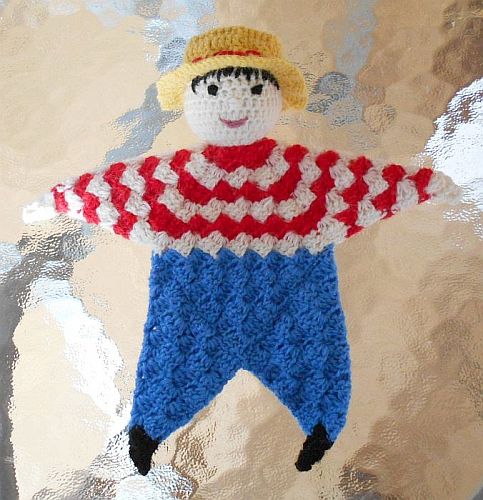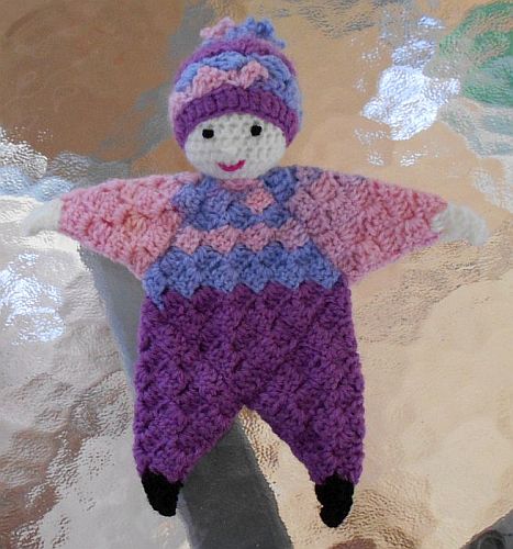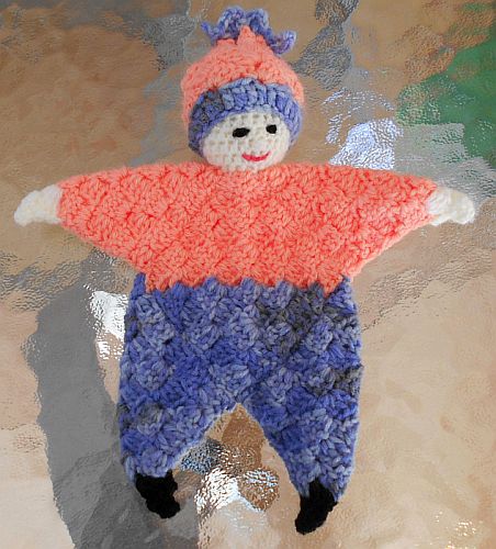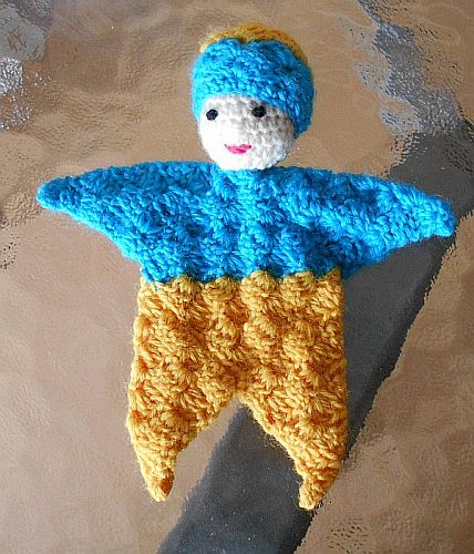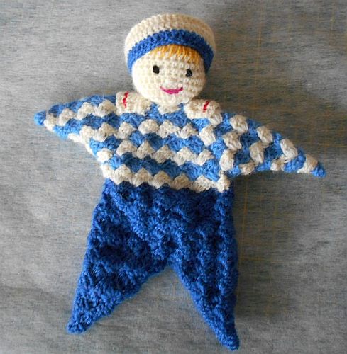 Dieser Muckele-Junge hat eine Pudelmütze auf - eine Häkelprobe findet eine gute Verwendung | ||