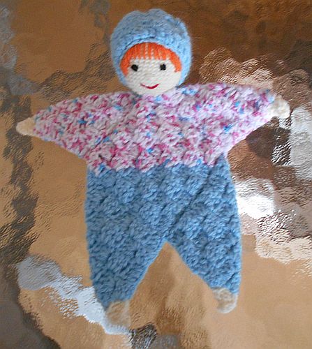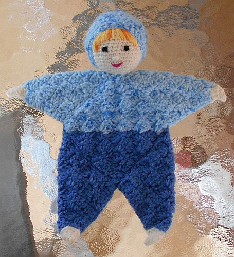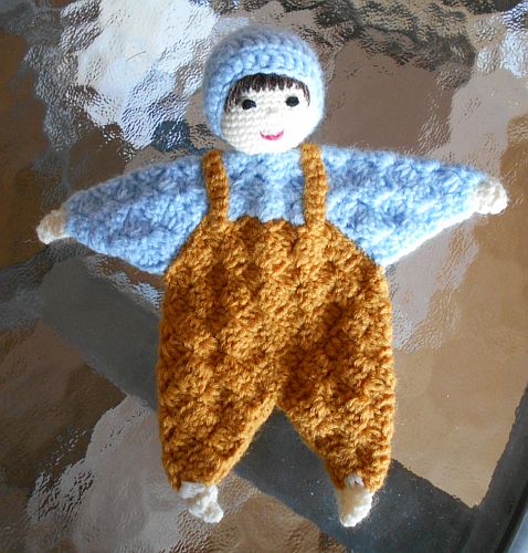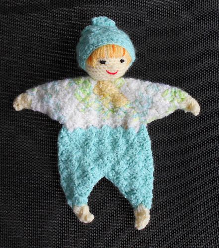 | Dieser Muckele-Junge hat eine Pudelmütze auf - eine Häkelprobe findet eine gute Verwendung | ||