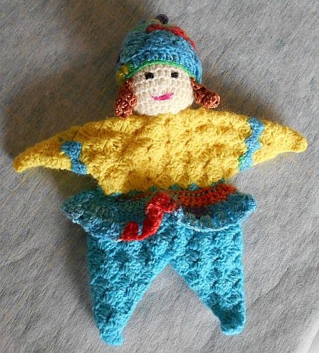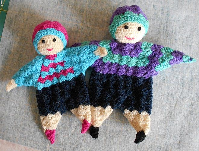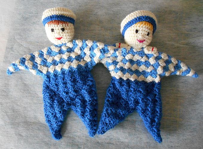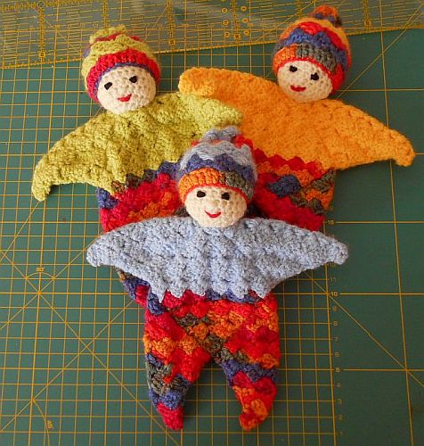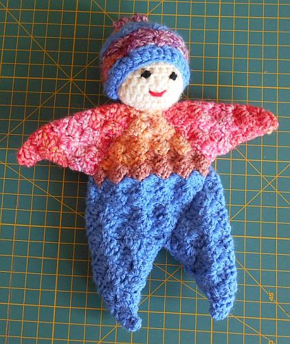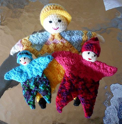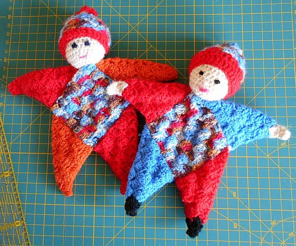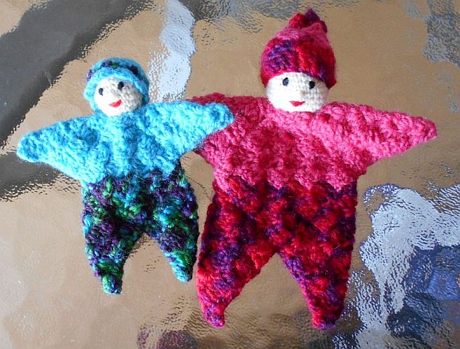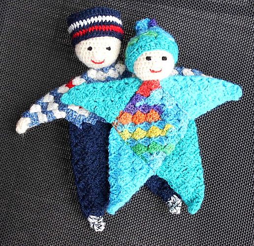 Bunt ist alles verhäkelt - Blau ist alles verhäkelt, daher Schuhe ud Hände - es hätte nicht mehr gereicht | 2 Sonntagskinder - da es die etwas kleineren Muckele sind, sind sie auch recht schnell fertig (47 und 48) | |
