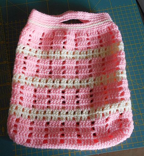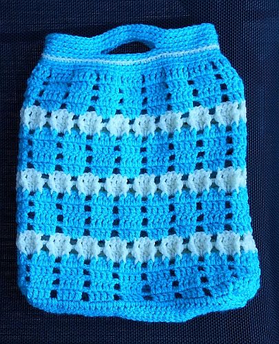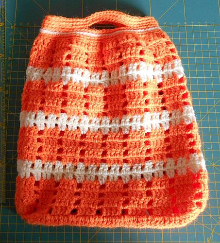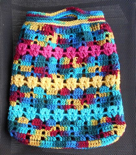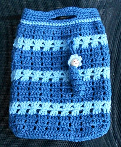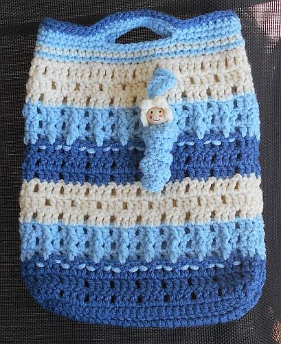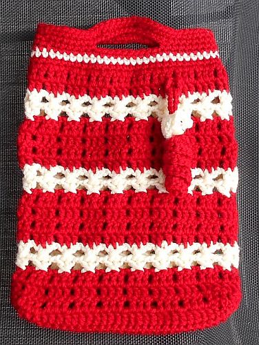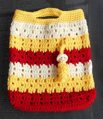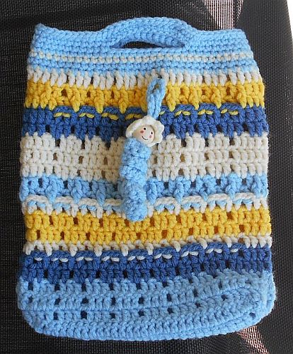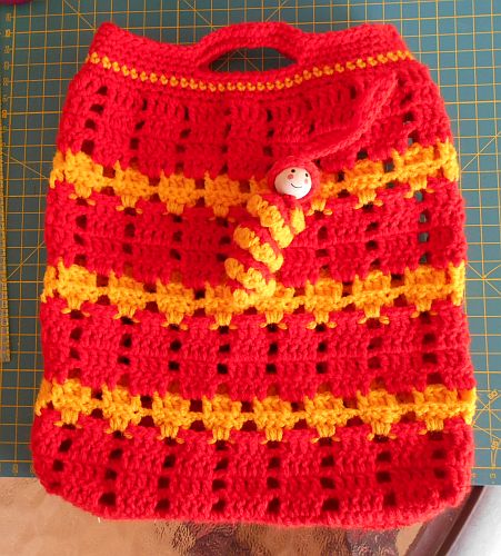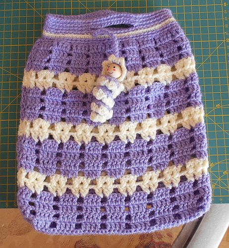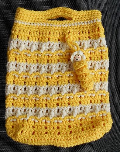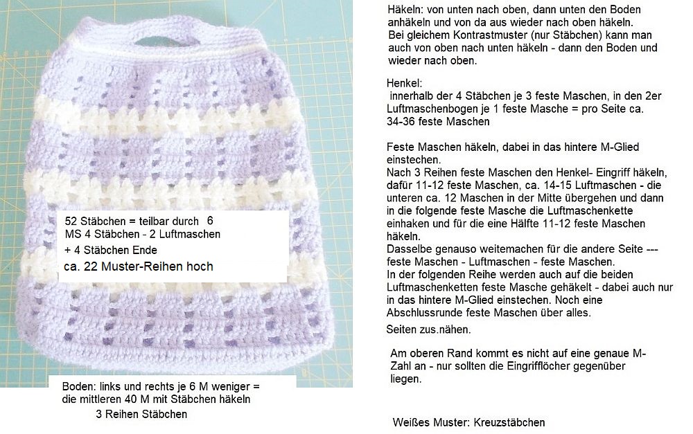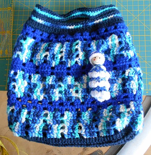 | Diese Täschchen sind aus etwas dickerem Acryl-Garn. Maße sind die gleichen, Maschen sind es nur 39. (3 Stäbchen-1 Luftmasche). Und natürlich ein Glückswürmchen dazu. | ||