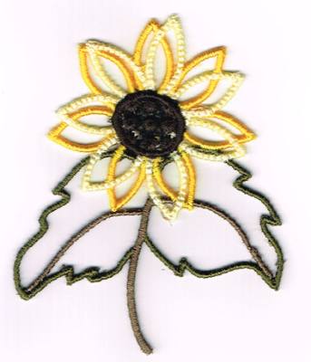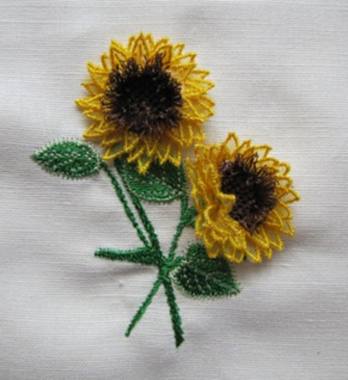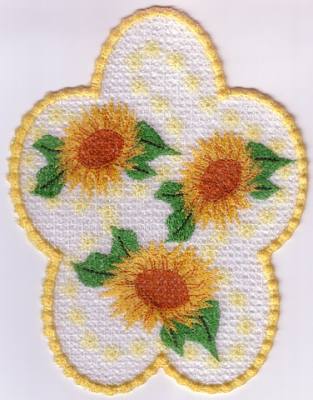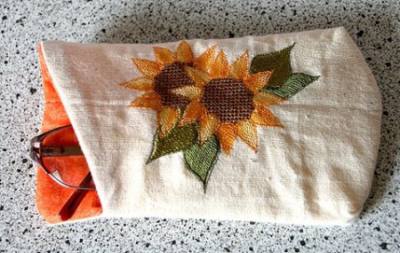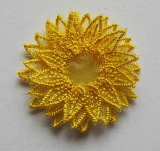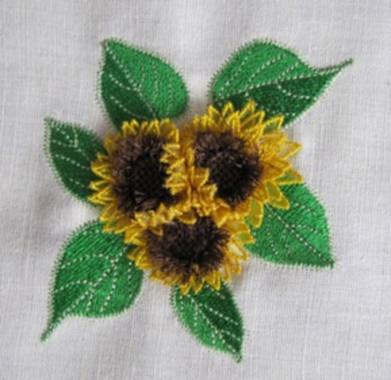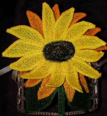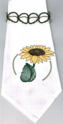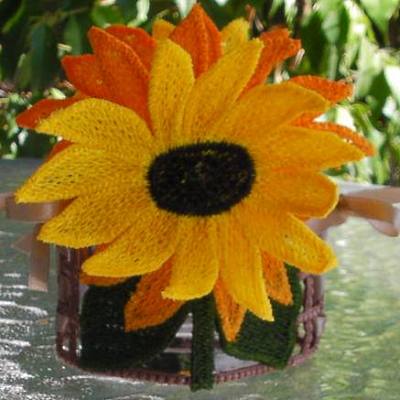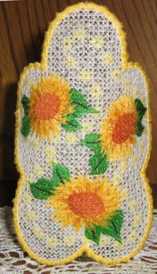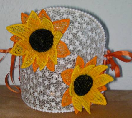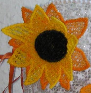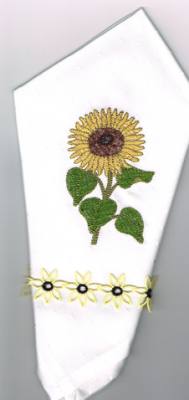 bestickte Servietten mit passenden Servietten-Ringen/Bändern | an eine einfache Windlicht-Hülle wurden 2 Lace-Sonnenblumen angesteckt | |