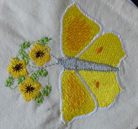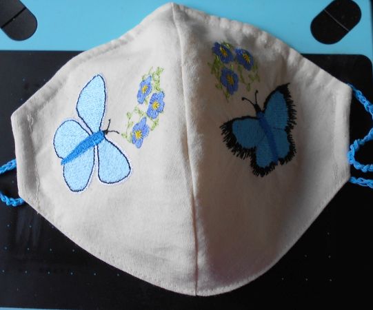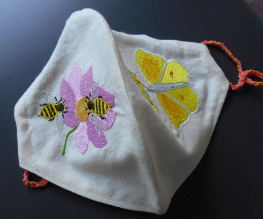 | Maskenzeit ... warum nicht auch mal gestickte? | Zum gelben Schmetterling gesellen sich einige Bienchen - die Trägerin der Maske wird nämlich "Biene" genannt | |
