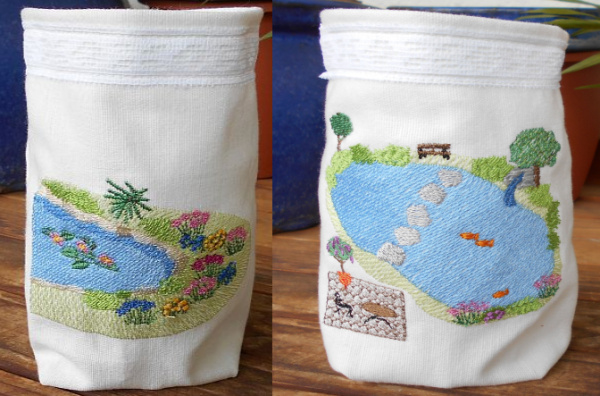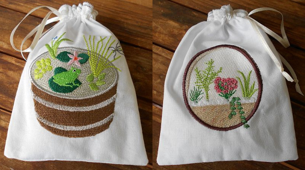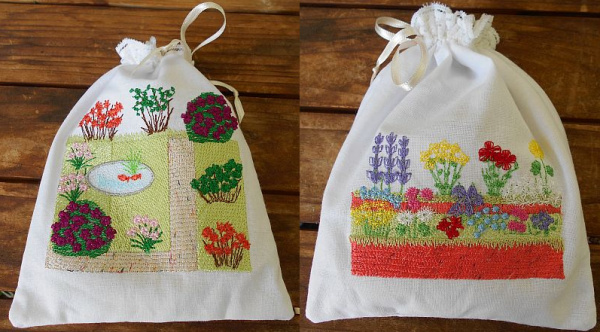 | Sogenannte "Leuchtbeutel" - da kann man gut Stickproben verwerten und hat dazu noch ein stimmungsvolles Licht auf dem abendlichen Balkon/Gartenplatz .... hinten rechts steht ein ehemaliges Senfglas, das passt wunderbar in die Beutelchen und gibt dem Teelicht ein sicheres "Zuhause". | ||