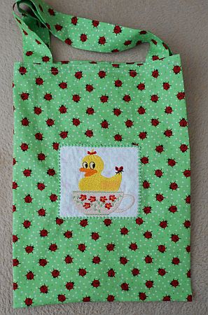 | Wenn es zu warm wird, muss Mini-Ente eben in der Teetasse baden ... | Ente als Applikation auf Stoff | |