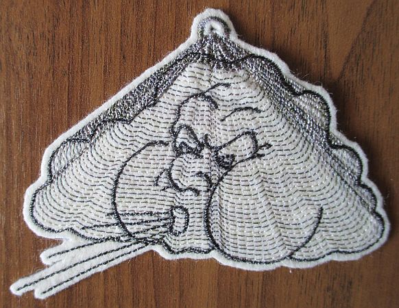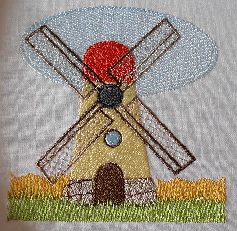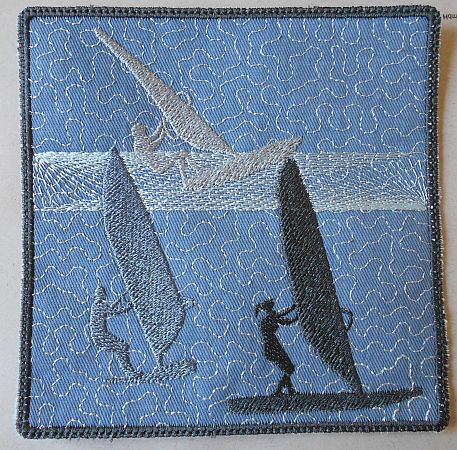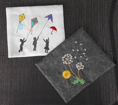 | Die gestickten Spiralen drehen sich nicht auf - da die innere Kante kürzer ist, bleiben sie so. Auch, wenn mal ein Regenschauer drüber geht. | ||