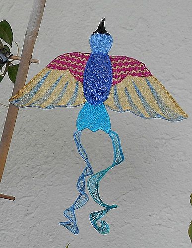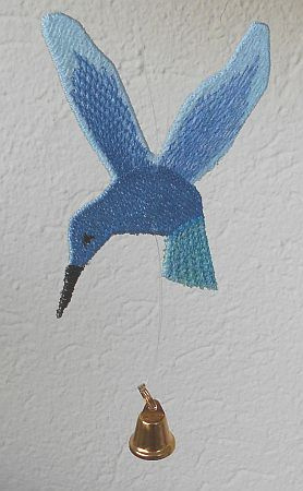 | Wenn man den Kolibri mehrfach stickt, könnte man ein hübsches Mobile daraus gestalten - das ist ja eigentlich auch ein "Windspiel". | ||