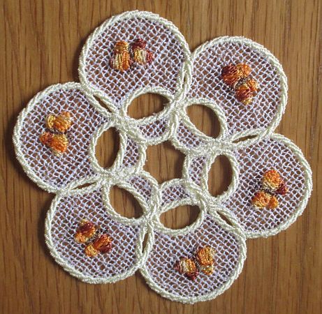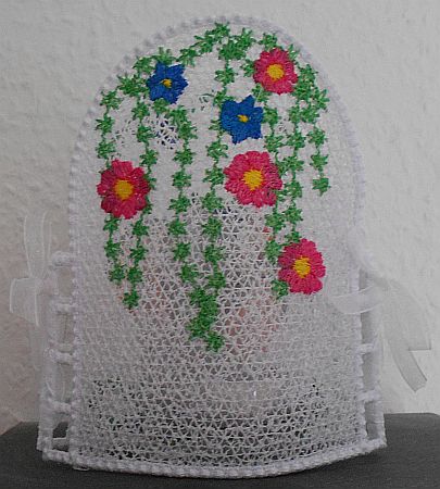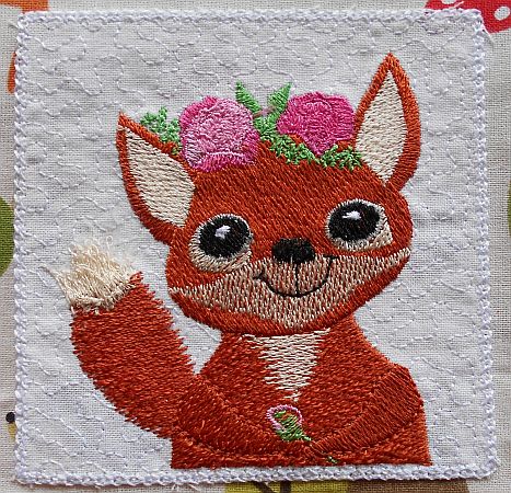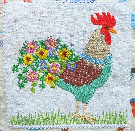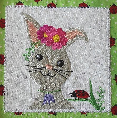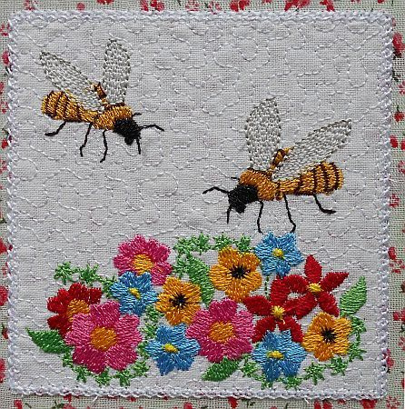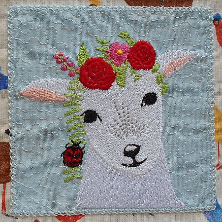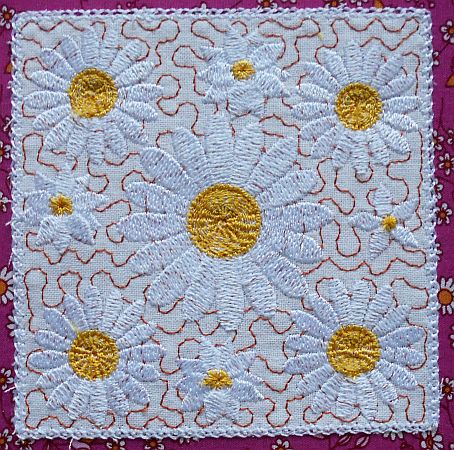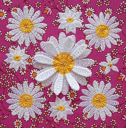 | Die Gänseblümchen sind direkt auf den Stoff gestickt, mit einer 3D-Blüte | ||