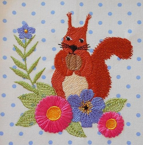| Eichhörnchen - auf Stoff gestickt, mit ungeschnittenen "Fransen"-Blüten | Hier sind sie aufgeschnitten und fransig - die lila Blüten kann man nicht aufschneiden | |